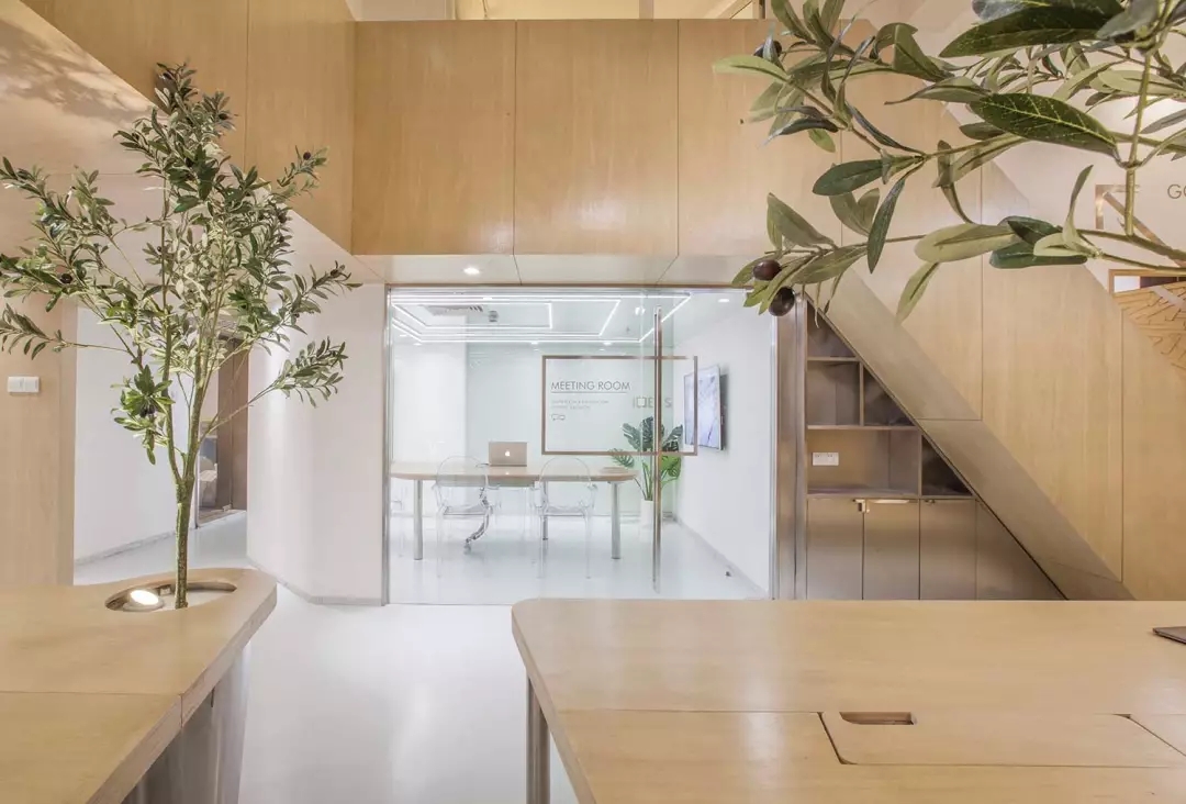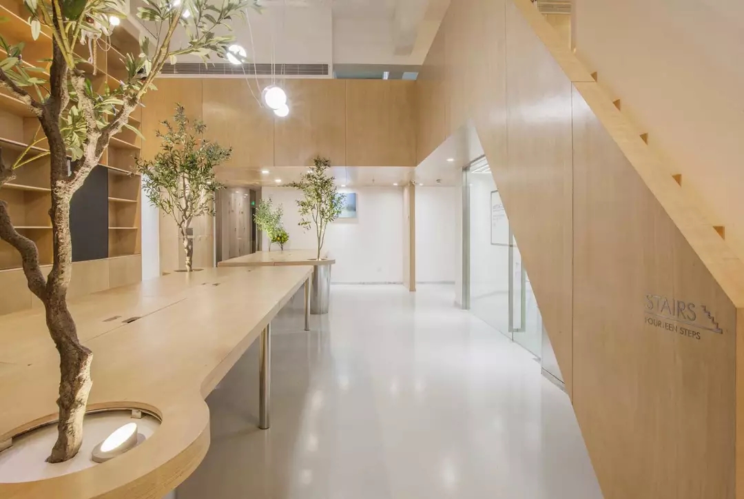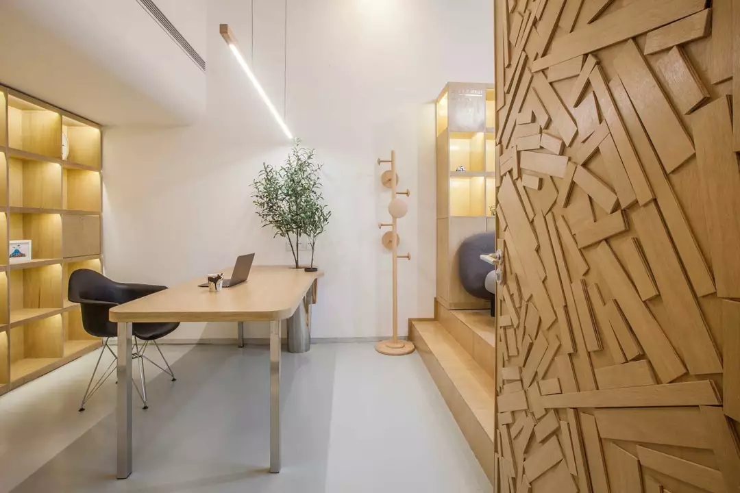 該項目位于上海市閔行區(qū)七寶萬科國際;我們希望工作室足夠的輕松、溫性、創(chuàng)意,于是通過顯性與隱性的符號對我們的目標進行構建;空間用了大量溫暖的木色,并組成木質(zhì)的空間體塊,這些體塊以整個白色空間為背景,進行功能與空間節(jié)奏上的構筑:
