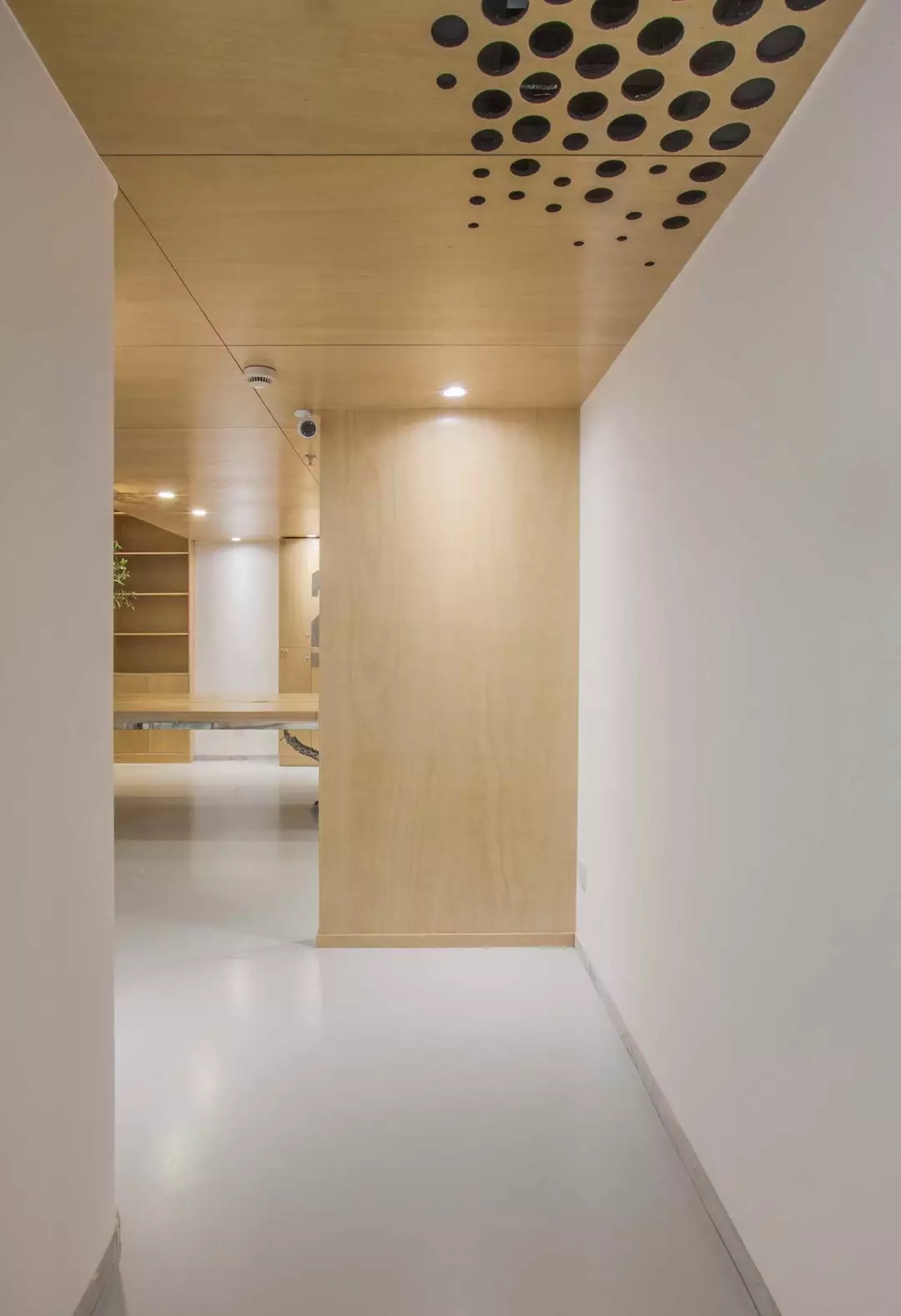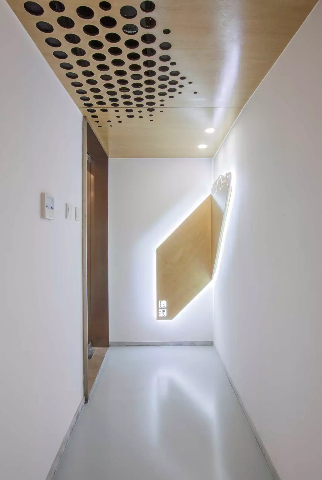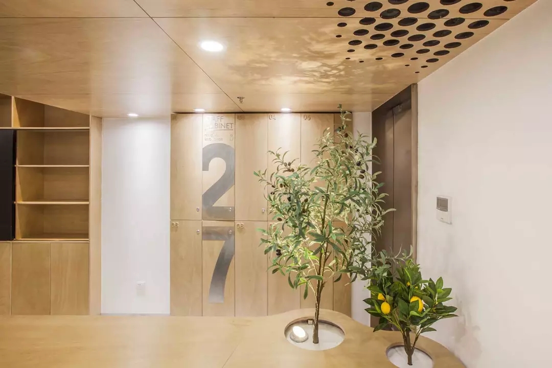功能融于樂趣與創(chuàng)意,兩個空調(diào)的回風孔也不能放過,市面上的百葉口為了實用而完全無法融入環(huán)境。由于吊頂也屬于木質(zhì)體塊,所以經(jīng)過試驗,一個充滿漸變的點陣圖形,解決了這個問題,不同規(guī)格的開孔器進過精心布置并開洞,讓空間回歸純粹與樂趣。