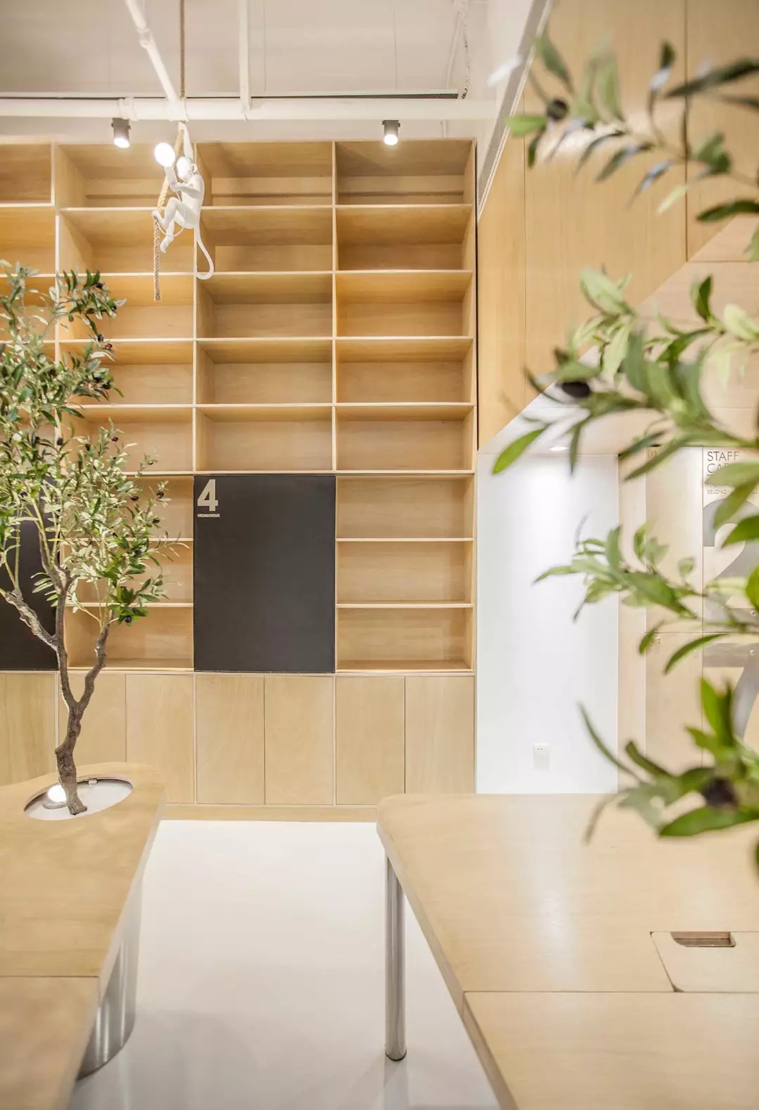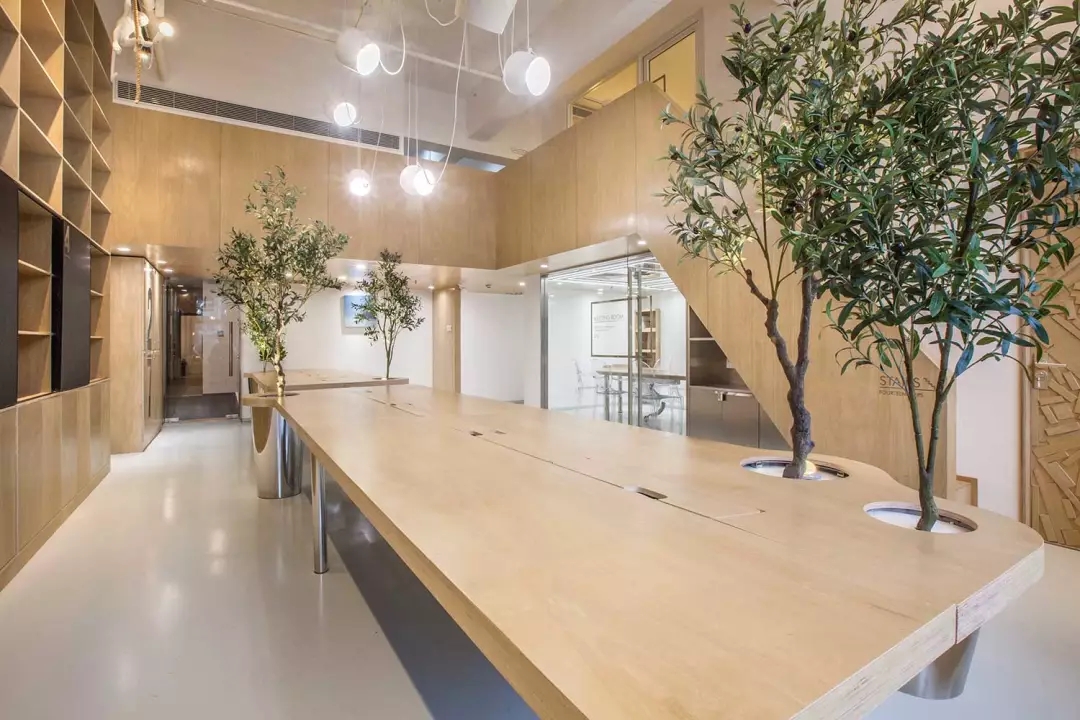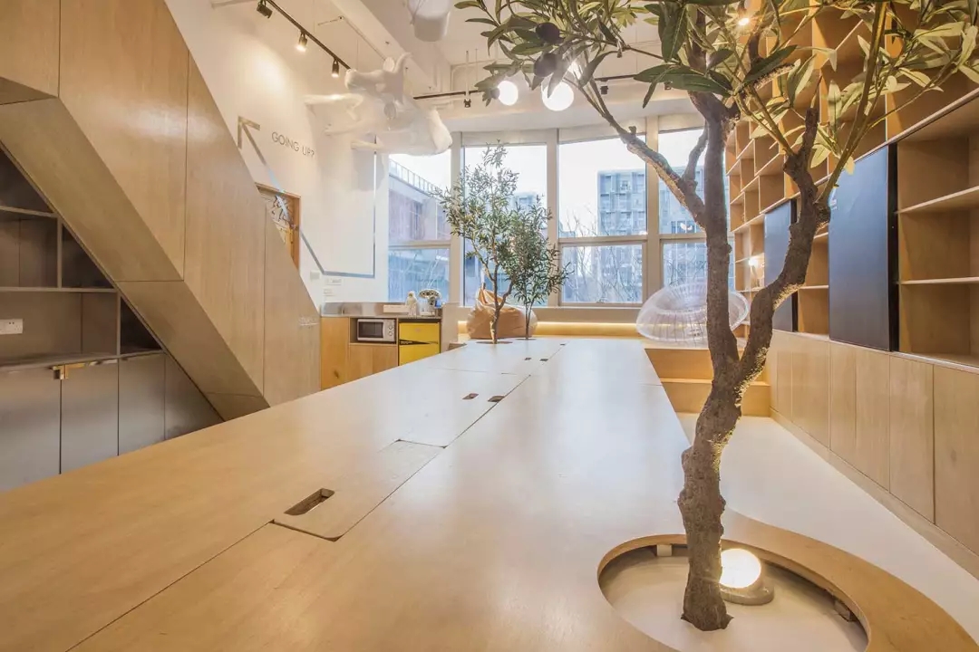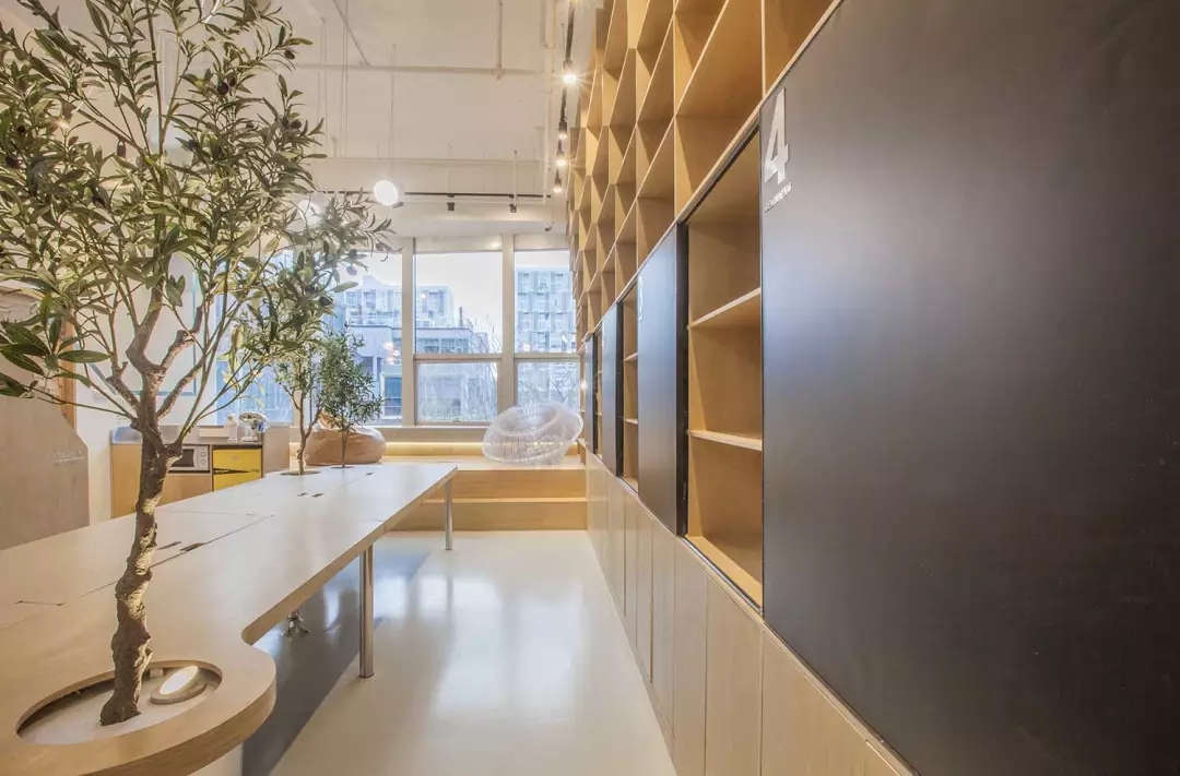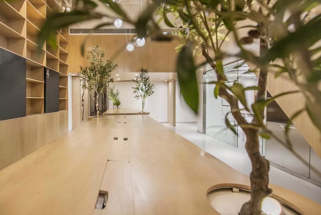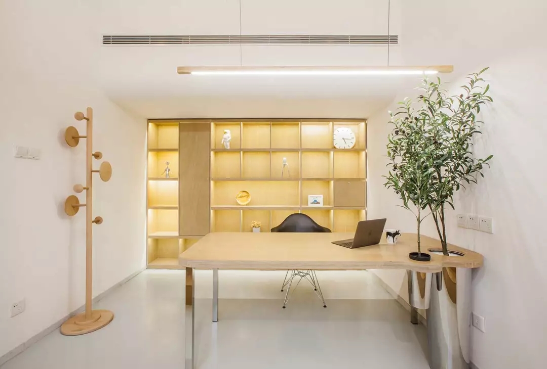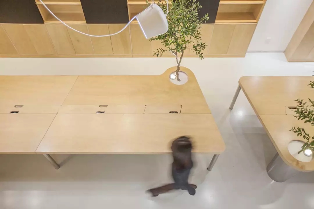 辦公桌與樹的結合,成為了整個空間的內(nèi)景觀,也與外面的綠色形成呼應,消減以往辦公的緊張氛圍。整墻的書架也不甘無趣,在實用的框架下,產(chǎn)生一絲波動的起伏,如同山崖,如同坡面。