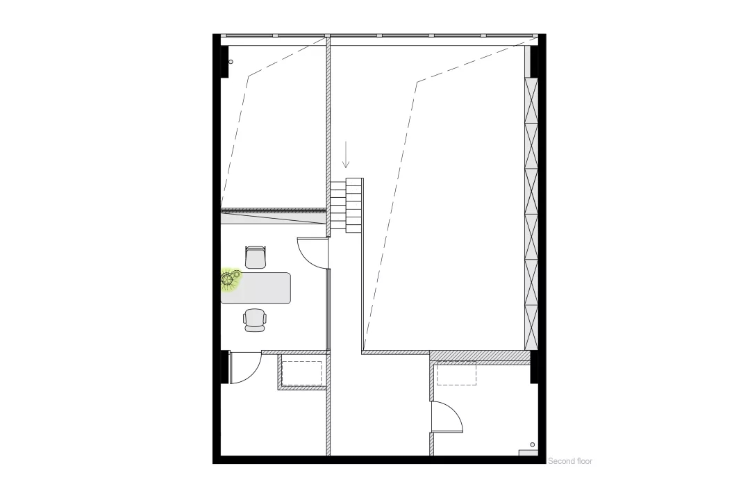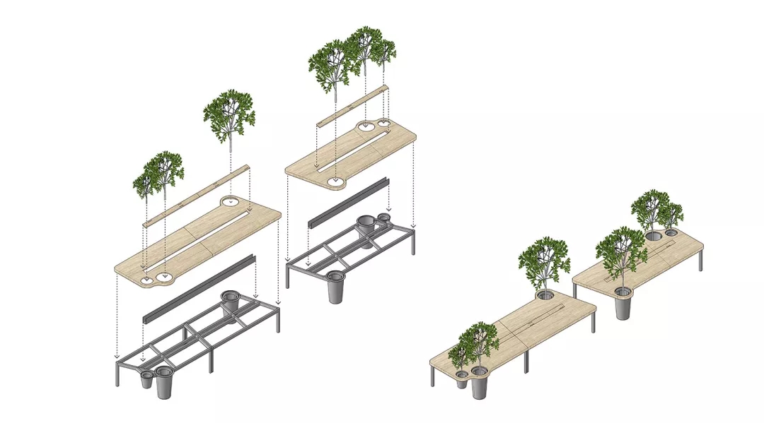 同時我們希望有一個張別具一格的會議桌,但是會議桌極強的功能性使得難以去進行改變。于是,會議室空間本身的形狀缺陷成了這張桌子想法的起點。由于避讓入口玄關,會議室空間有一個角是切掉的,墻壁是斜著放置,如果是長方形的會議桌,就必然在這個斜墻前造成使用空間不夠缺陷,無法坐人.所以就產(chǎn)生了一個平行四邊形的會議桌,斜邊與空間的斜墻平行,也讓整個斜墻前的空間可以坐下一個參會者,再嵌入一些小草,一張獨特又實用的會議桌就出來了。