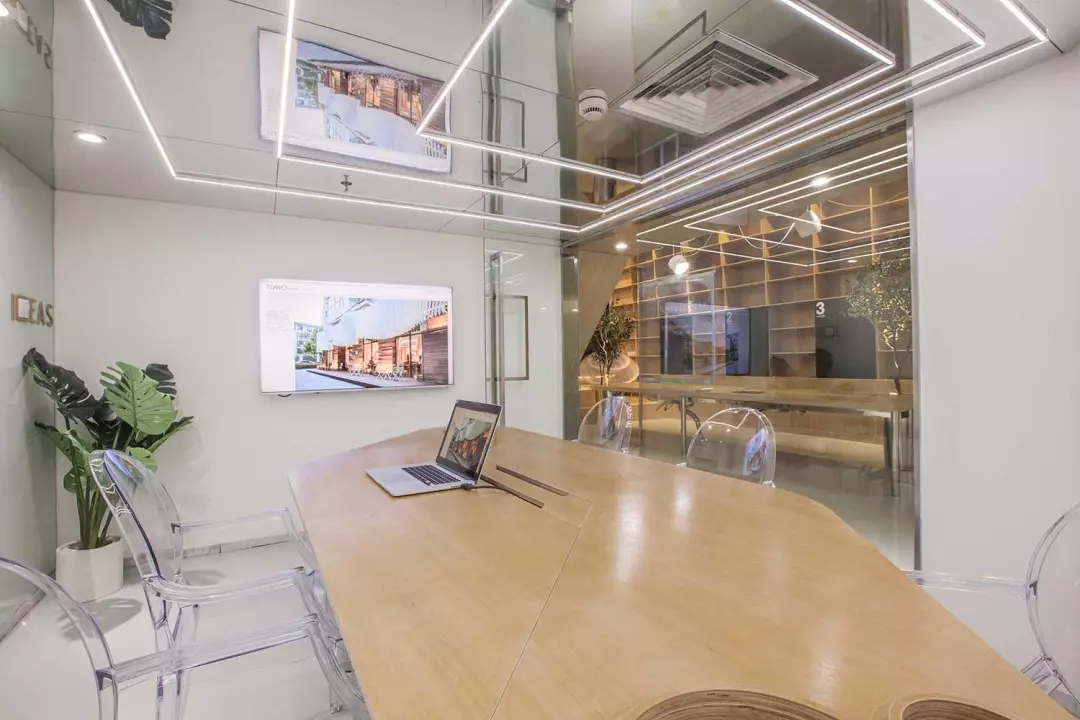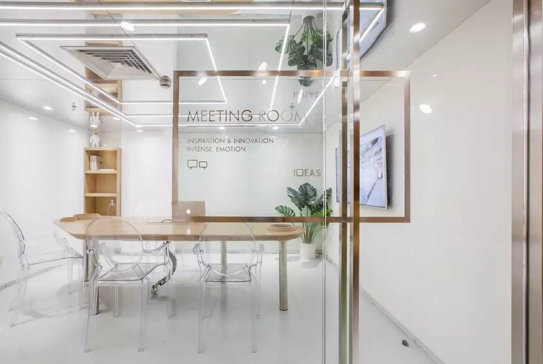 由于層高的限制,會議室感覺比較壓抑,所以將整個天花變?yōu)殓R面,化解的層高的局限,也讓空間感別具一格.但是空調(diào)的出風散流器非常扎眼,空調(diào)的位置決定了風口位置無法移動。而市面上又找不來合適的可以符號化的替代品,于是,就順勢而為,將會議室的照明以散流器為中心進行布置,讓散流器的方框與燈光呼應起來,形成了會議室有意思的圖形。