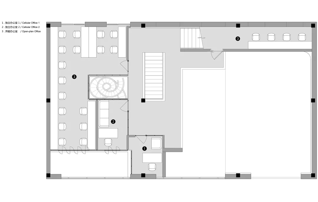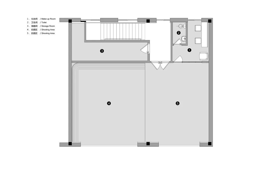 ASTUDIO攝影工作室位于CBD東側菁英谷文創(chuàng)園內(nèi),整體的設計風格融合了粗狂工業(yè)風和現(xiàn)代簡約風。原有建筑為雙層的廠房空間,這種大空間非常適合拍攝的需求。攝影師希望把這個大空間改造為兩個相對獨立的拍攝區(qū),并且有各自獨立的化妝間和出入口,從而可以同時進行兩場獨立的拍攝。UUA將原有的二層建筑在豎向上改造成為了三層的空間,其中第一層包含接待區(qū)和1號拍攝區(qū),第二層整體為辦公空間,第三層是2號拍攝區(qū),這種豎向上的分區(qū)保障了兩場同時拍攝的獨立性。