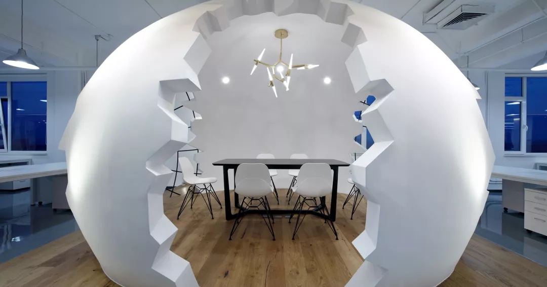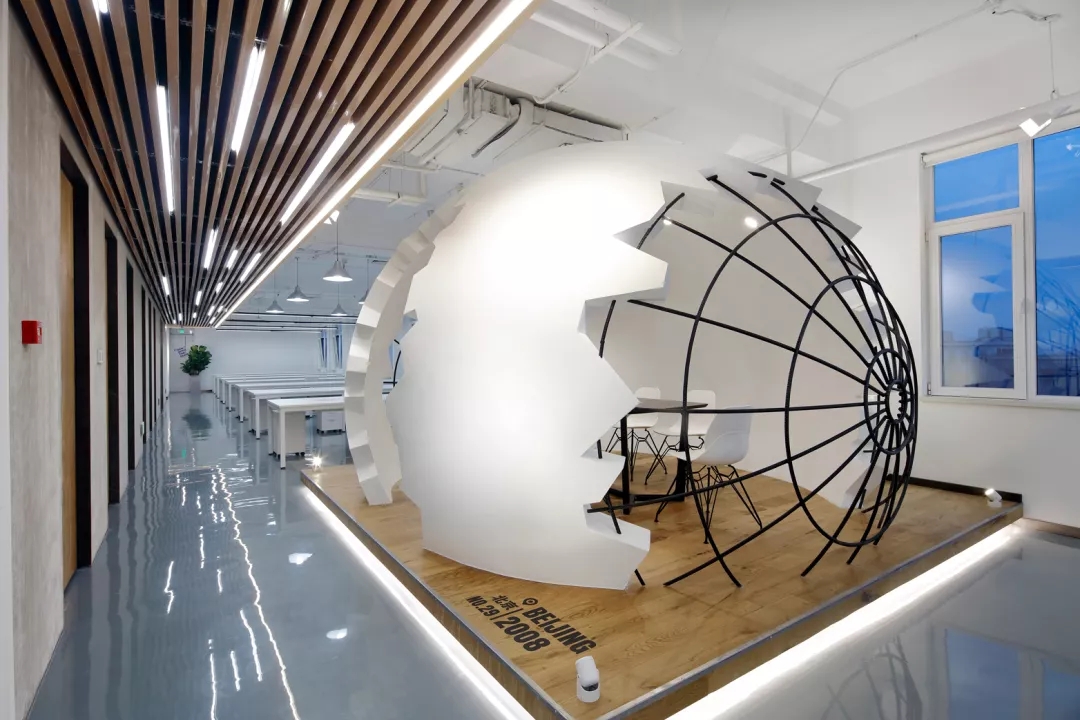 為了給開放式的辦公空間注入活力,我們?cè)谂排抛墓の粓?chǎng)地正中設(shè)置了“破殼而出“的主形象——巨蛋討論區(qū),橢圓形的蛋壁實(shí)現(xiàn)攏音的隔音效果,兩側(cè)的鏤空引入自然光源,令這個(gè)裝置藝術(shù)般的討論區(qū)打破開放式工位的沉悶,成為視覺(jué)焦點(diǎn)。