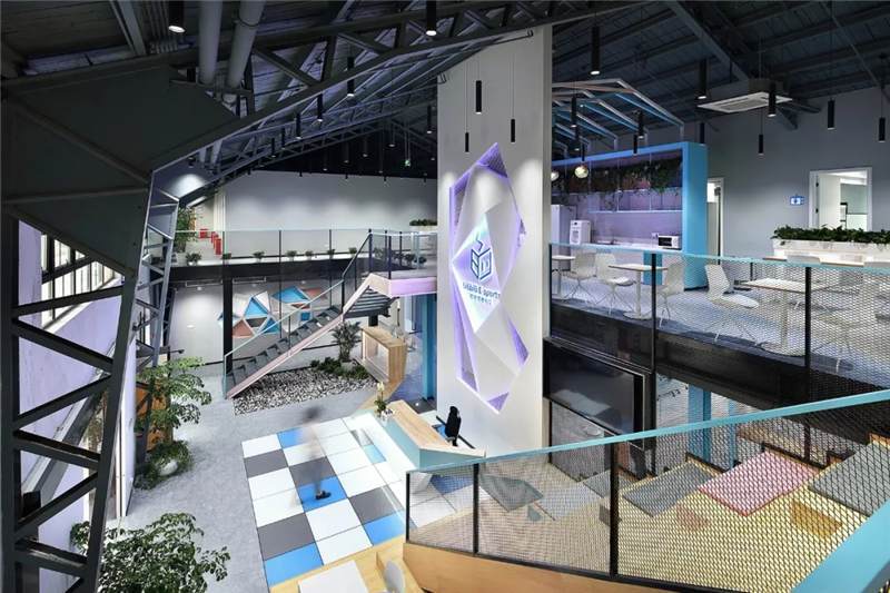 本案位于上海市寶山區(qū)蘊(yùn)川路6號智慧灣科創(chuàng)園,原建筑為3D打印的廠房裝修,室內(nèi)最高凈高9米,最低6.4米。此空間除原建筑結(jié)構(gòu)墻外,無任何結(jié)構(gòu)柱與墻體,因此為了更充分合理的利用空間,設(shè)計(jì)師構(gòu)筑了二層,根據(jù)嗶哩嗶哩電競的辦公功能訴求,布置空間功能區(qū),即1F分布前臺區(qū)、會議區(qū)、茶水接待區(qū)、賽訓(xùn)室、開敞辦公區(qū)、導(dǎo)播室。2F分布就餐區(qū)、住宿區(qū)、導(dǎo)播室等空間。