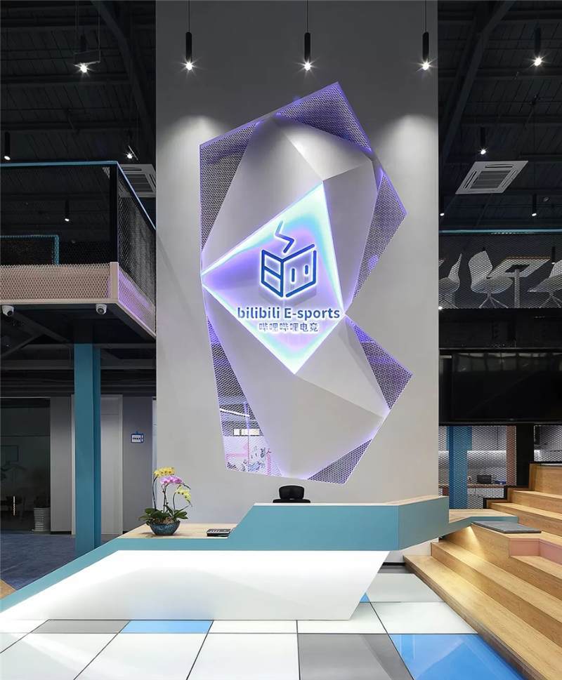 前臺接待區(qū)利用建筑結(jié)構(gòu)挑空空間的優(yōu)勢,塑造9米高的具有未來雕塑造型藝術(shù)感的LOGO背景墻,結(jié)構(gòu)形態(tài)上,設(shè)計(jì)師運(yùn)用B站文化中的創(chuàng)意與元素,中間由三維立體幾何造型與鐵絲網(wǎng)拼接而成,配以藍(lán)色燈光,彰顯公司文化的同時呈現(xiàn)電競的科技感,使得整體背景墻,體量和形態(tài)上給往來訪客和員工強(qiáng)烈的視覺沖擊感。
