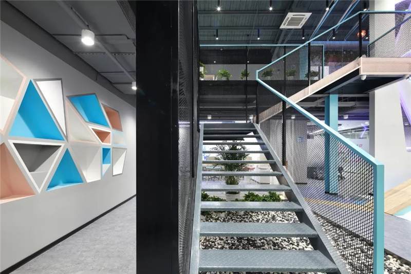 前廳左側(cè),設(shè)計(jì)結(jié)構(gòu)簡單的樓梯,運(yùn)用與二層欄桿材質(zhì)相同的鐵絲網(wǎng)扶手,使得兩層樓形成一個工業(yè)風(fēng)的整體。側(cè)邊與扶手點(diǎn)綴以藍(lán)色和粉色的噴漆,樓梯下布置用鵝卵石,仙人掌和燈光組成的景觀裝置小品,讓整個電競空間生機(jī)勃勃,平添許多年輕活躍的氛圍。此處木飾面的吧臺延伸到地面再與前臺、右側(cè)大臺階連接形成一個整體,使整個空間更加連貫統(tǒng)一。