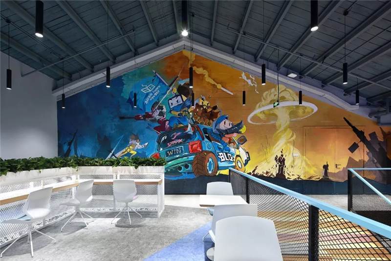 二層大臺階入口處設(shè)計(jì)師設(shè)置醒目的電競主題手繪圖,巧妙的把原本的雙開門變成隱形門,墻內(nèi)部為電競導(dǎo)播室。手繪圖豐富的色彩,突出的電競主題,卡通的形象,把BILIBILI的風(fēng)格呈現(xiàn)的淋漓盡致。