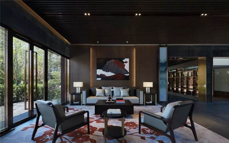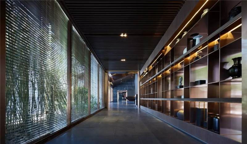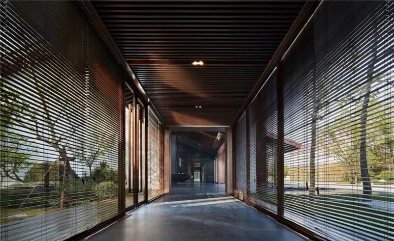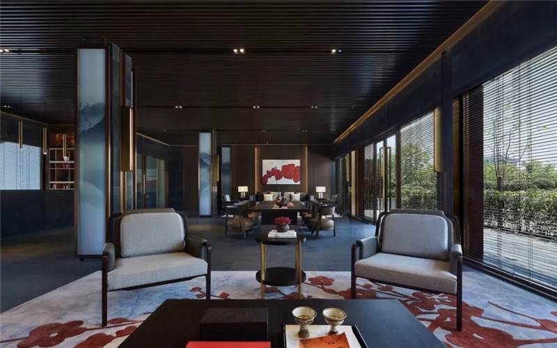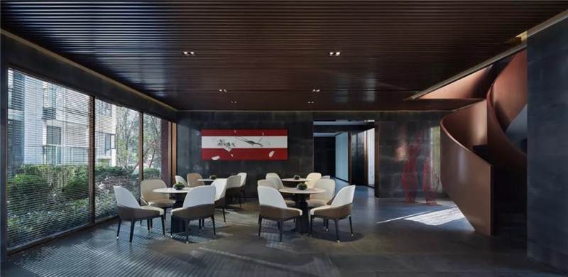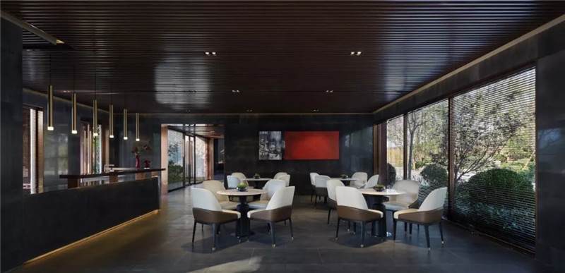 大堂西側(cè),全景落地玻璃及百葉搭配,加以園林框景手法,呈現(xiàn)意境之美、隱隱約約之效。穿回廊而過,便見洽談區(qū),頓時(shí)豁然開朗。