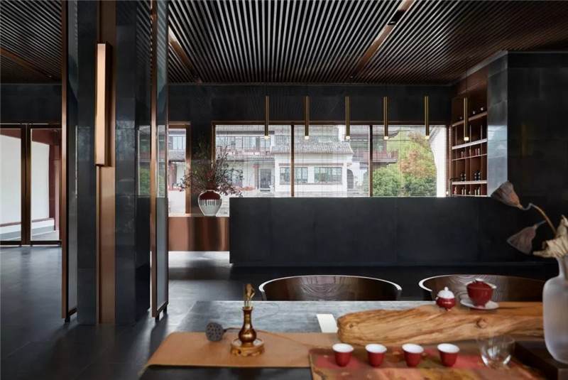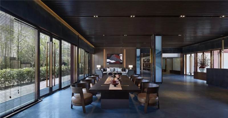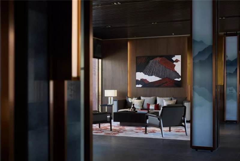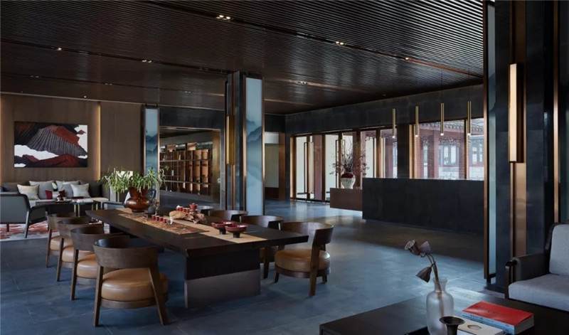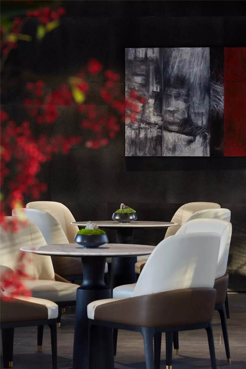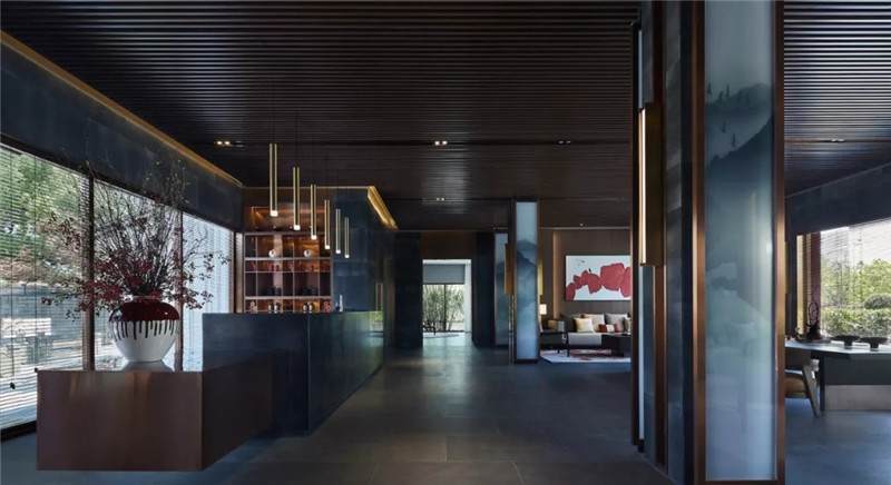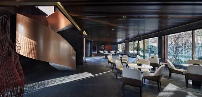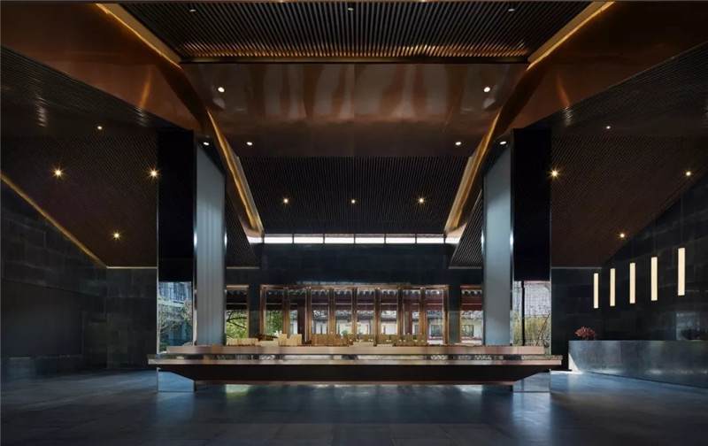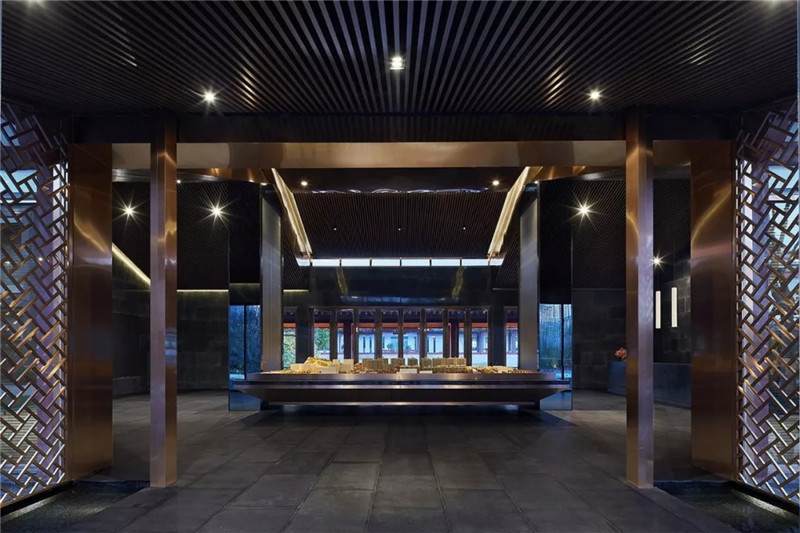 大堂內(nèi)注重材質(zhì)的克制與平衡,大面的黑色基底將儀式感與雄渾氣勢渲染而出。金屬鏤空格柵顯江南韻律,斜屋頂及頂端挑空區(qū)窗口,則是對(duì)傳統(tǒng)物態(tài)的解構(gòu)與再造。剝開視覺表象,映射出來的是現(xiàn)代、東方、藝術(shù)、自然等內(nèi)核元素,給賓客無與倫比的感官體驗(yàn)。
