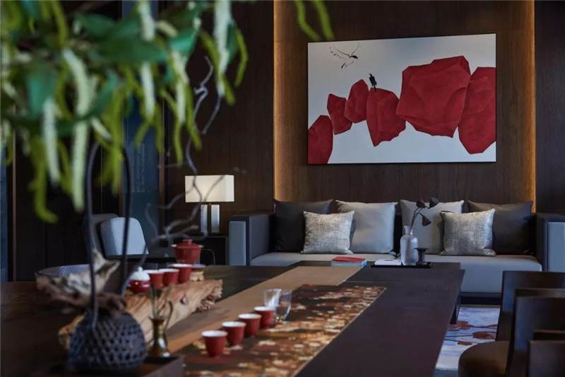 桌面借由點(diǎn)點(diǎn)紅綠添色,打破單調(diào),越發(fā)渲染生機(jī)與活力。兩端放置著極富水墨暈染狀的抽象畫作,以厚重的文化底蘊(yùn)來響應(yīng)當(dāng)下的時(shí)空與場域。