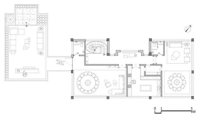 二樓設(shè)有兩間獨(dú)立包廂,供賓客攜友享用。保留古建筑原有傾斜屋頂,尊重格局而做設(shè)計(jì),大道至簡,方圓之間,各得其妙。借由通透的落地窗引入美好景致,讓視線變得有趣,用餐更為舒適、自然。