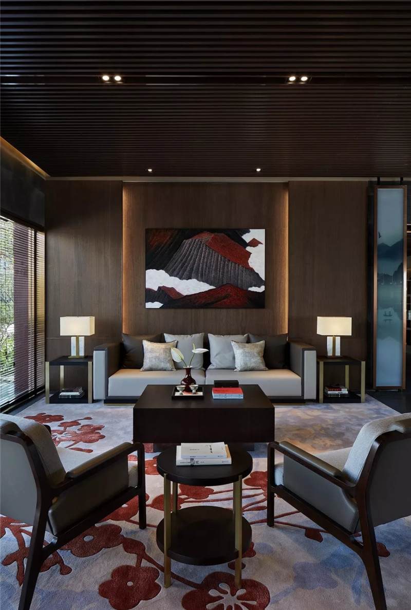會(huì)客區(qū)處于中心茶臺(tái)兩端,對(duì)稱的手法、圍合的陳列、適宜的比例,實(shí)現(xiàn)多樣元素的碰撞演繹,剛?cè)岵?jì),飽含層次感。主背景木飾面嵌古銅,加上燈帶設(shè)置,顯得安靜而溫潤。