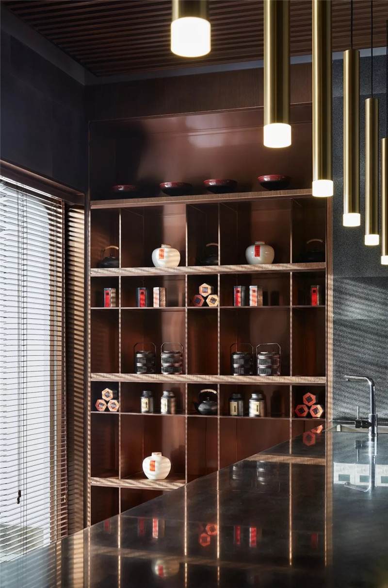 傳統(tǒng)古樸的根雕茶臺(tái)、日式絲織茶席,結(jié)合多樣材質(zhì)混搭,鋪展開一室古雅清愜。于此飲茶一甌,以裊裊升騰的水霧構(gòu)就品茗論道的精神棲居。水吧臺(tái)與茶室相對(duì),茶文化展示架使用木格與金屬層板相交設(shè)置,以其跳躍性突破常規(guī)。