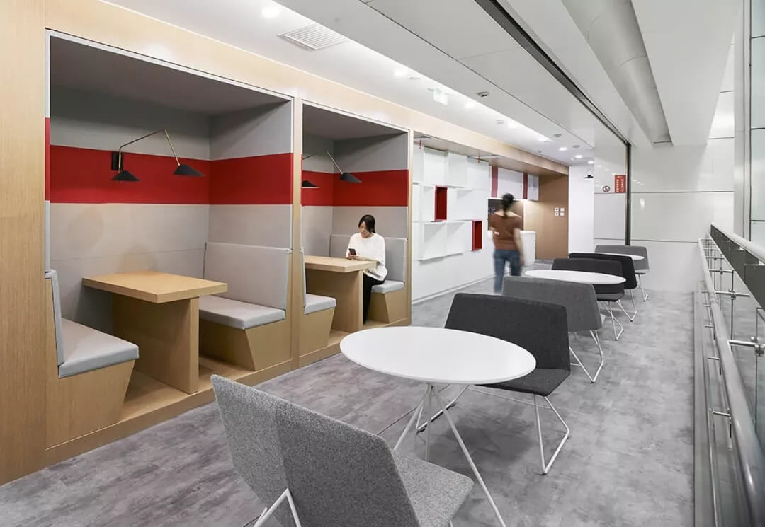 核心筒是整個辦公空間的混合功能區(qū),頻繁產(chǎn)生互動式交流,頭腦風(fēng)暴,也是重要的會客及自由移動式辦公區(qū)。在設(shè)計上,艾迪爾設(shè)置了滿足不同會客需求的休閑討論區(qū),連接著標準辦公區(qū)和公共通道,營造多層次交流氛圍,體現(xiàn)商湯科技開放包容的文化價值觀。