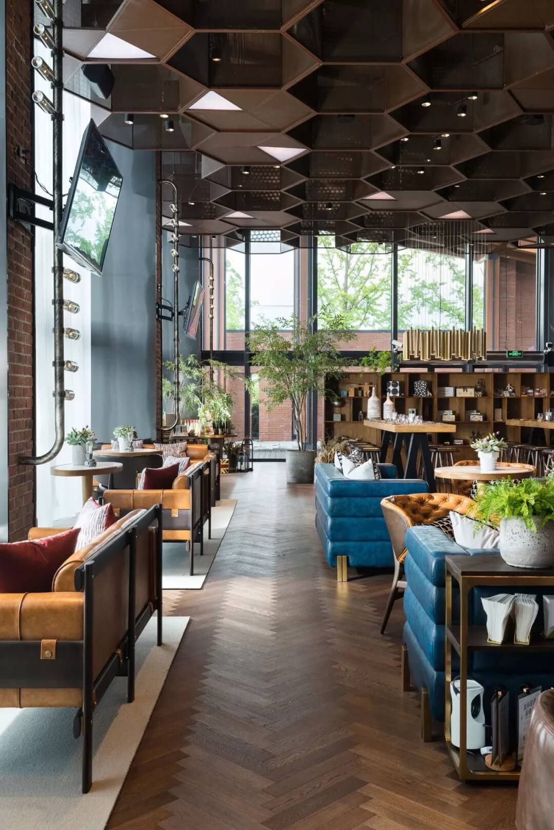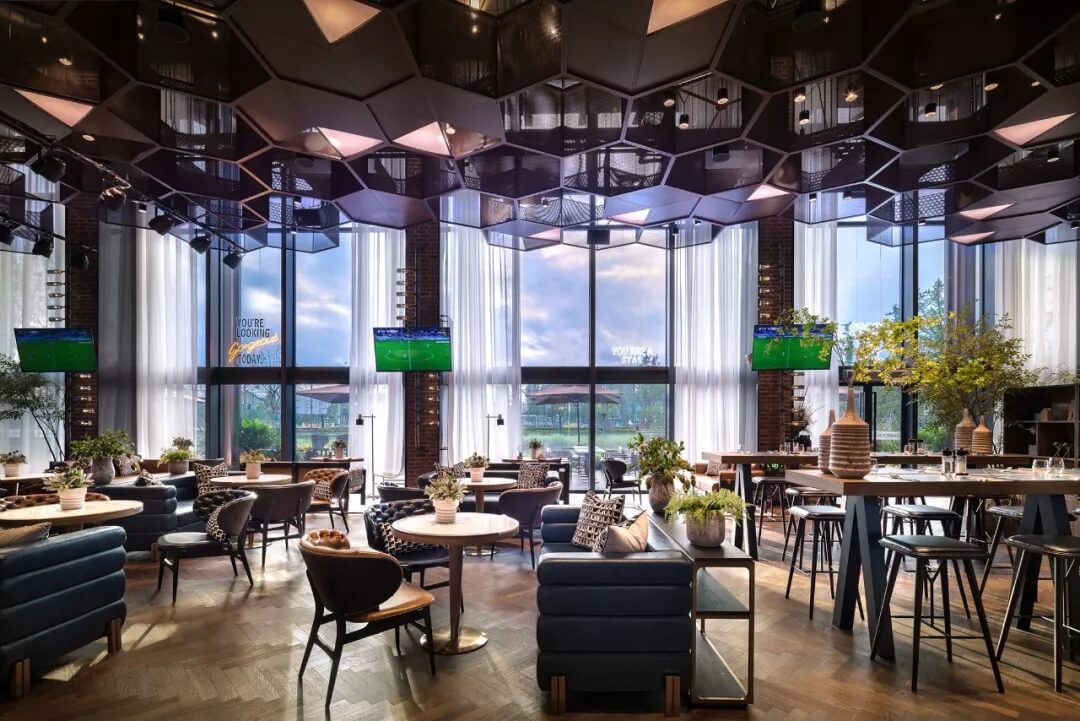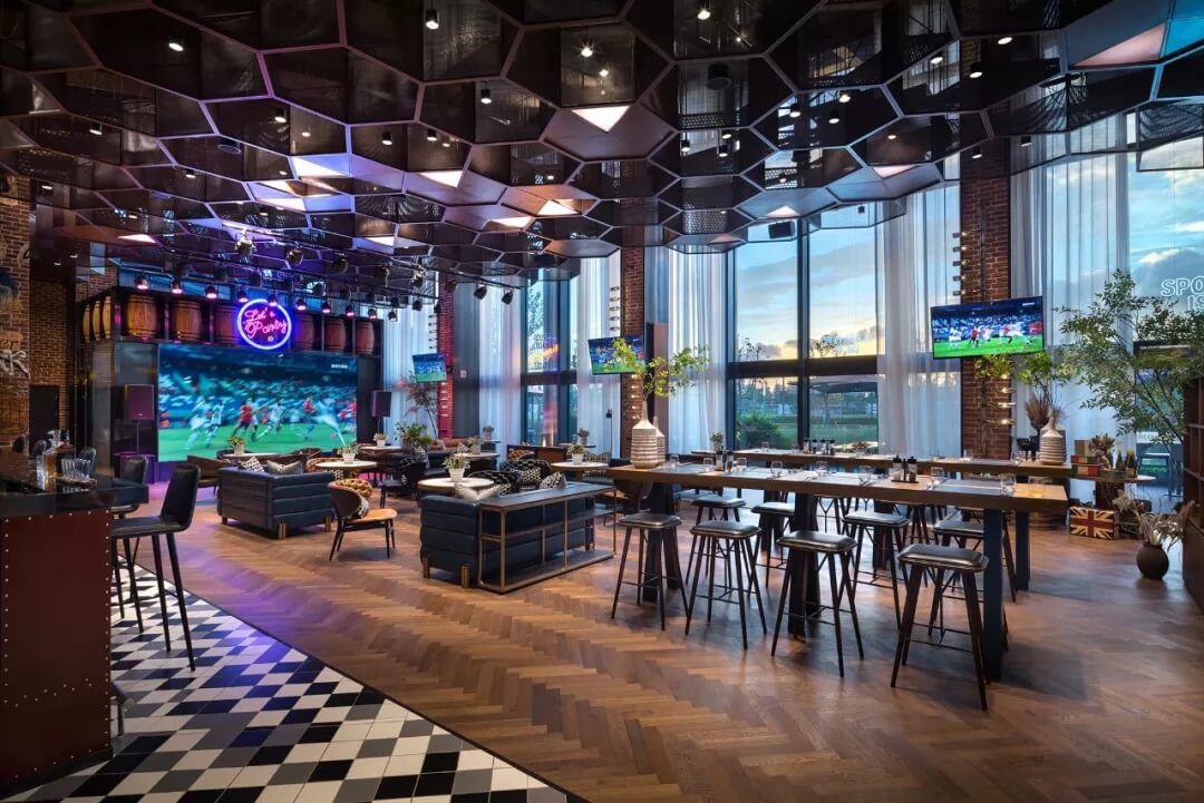 設(shè)計(jì)將足球的六邊形化用于天花的裝飾上,立體幾何的體量、金屬線條的質(zhì)感賦予了社交空間的適當(dāng)距離感。多幅大屏幕的配置,讓聚于此的人們,沉浸于啤酒吧和比賽現(xiàn)場(chǎng)的氛圍當(dāng)中,盡情享受在開闊大氣的空間格局中觀摩賽事的自由,為熱愛喝彩,為夢(mèng)想干杯,傳遞運(yùn)動(dòng)不止的精神。
