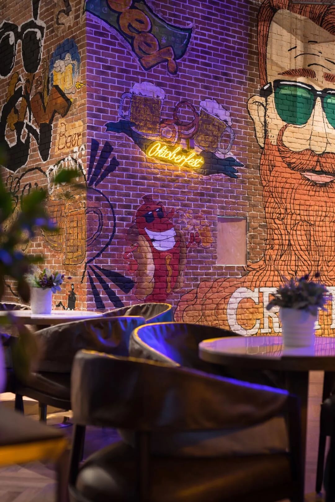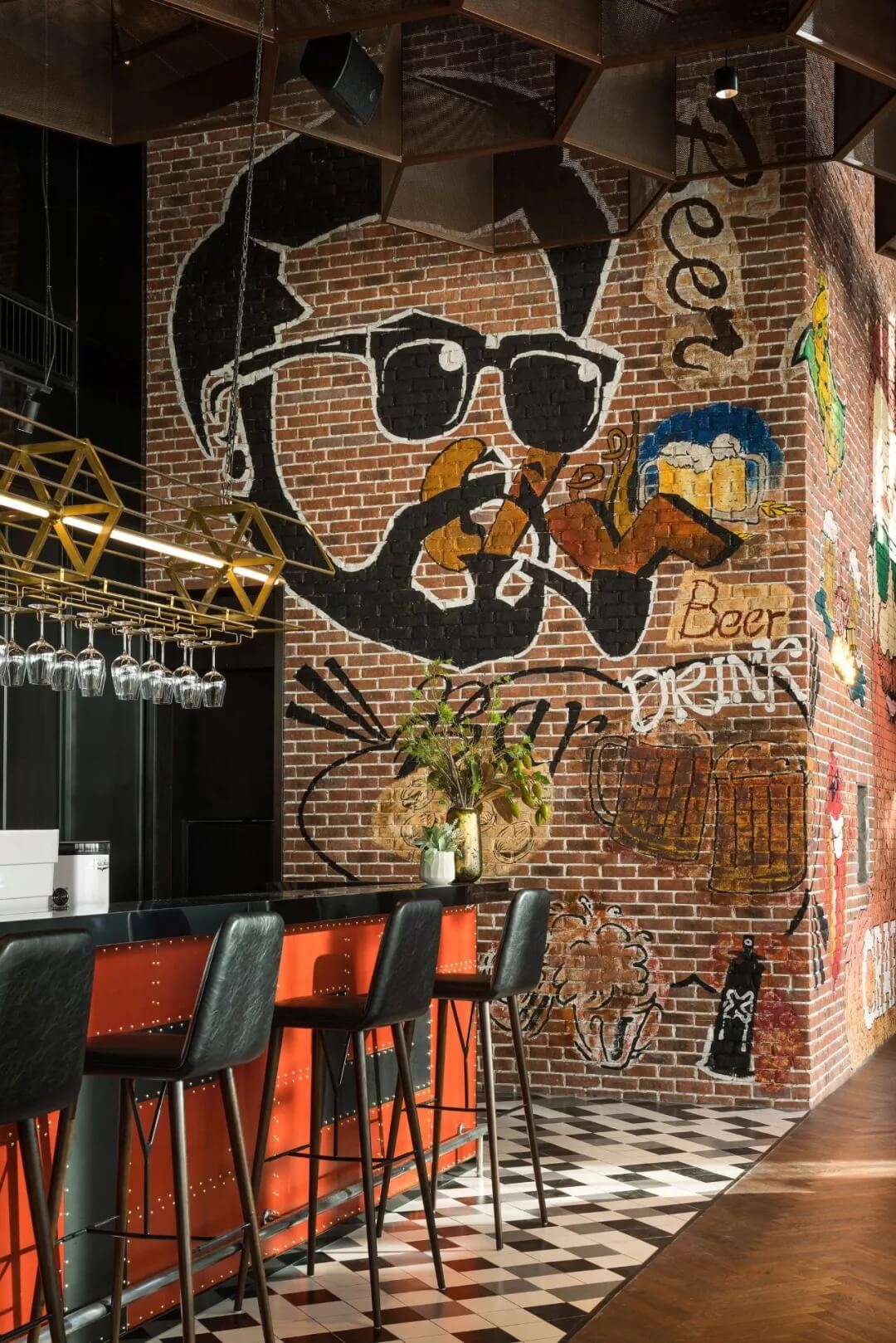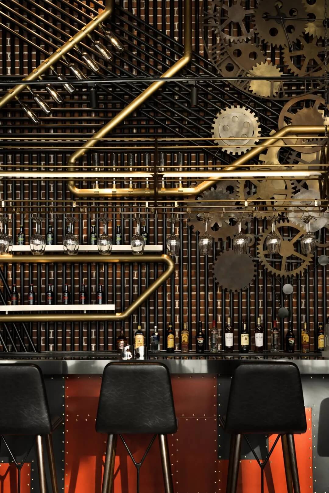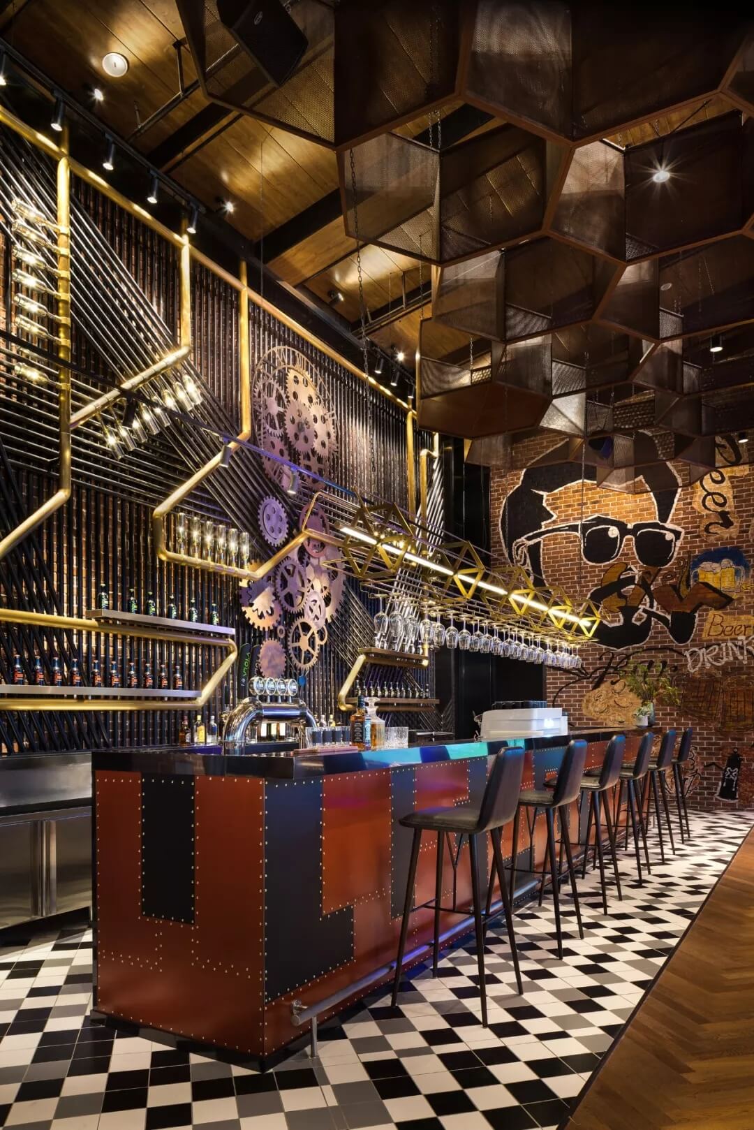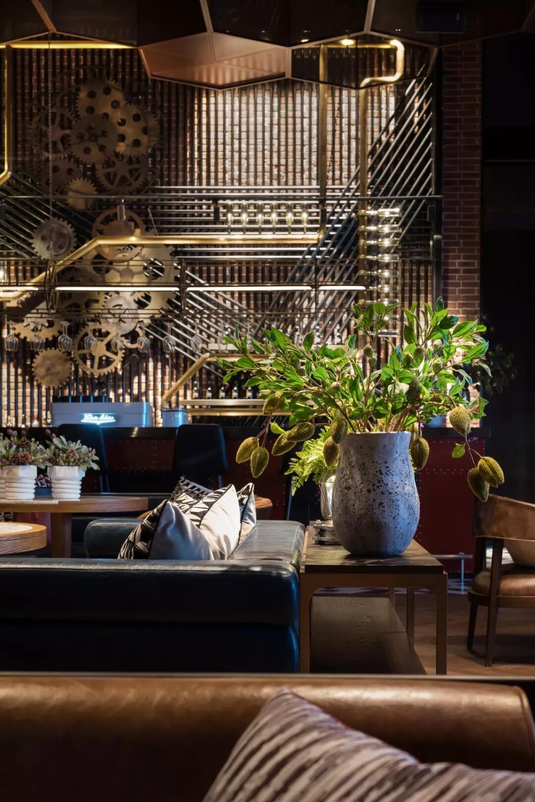 工業(yè)風(fēng)的精髓在于,在原空間樸拙素簡的本真狀態(tài)下延展其自由隨性的氣質(zhì),在粗獷的空間架構(gòu)中消解拘束感,呈現(xiàn)出大氣又不失細(xì)膩的美感。粗礪的紅磚墻、朋克夸張的墻畫涂鴉、裸露的管道線路、復(fù)古做舊的齒輪掛件、紅黑交接的鉚釘吧臺(tái)......統(tǒng)攝進(jìn)工業(yè)風(fēng)的設(shè)計(jì)常規(guī)之中。