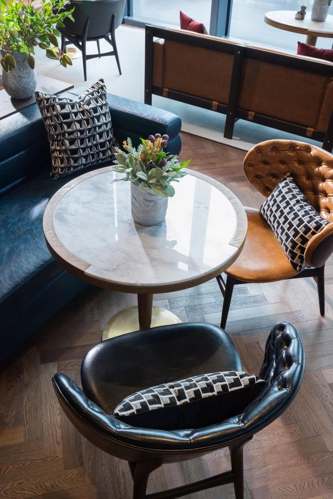 設(shè)計(jì)運(yùn)用極簡的語言,打開空間與自然的悄聲對(duì)話,咖色的皮質(zhì)沙發(fā)、幾處花藝、數(shù)個(gè)土陶裝飾,充盈著活力與生氣,人們置身此處,身心分外舒愜。