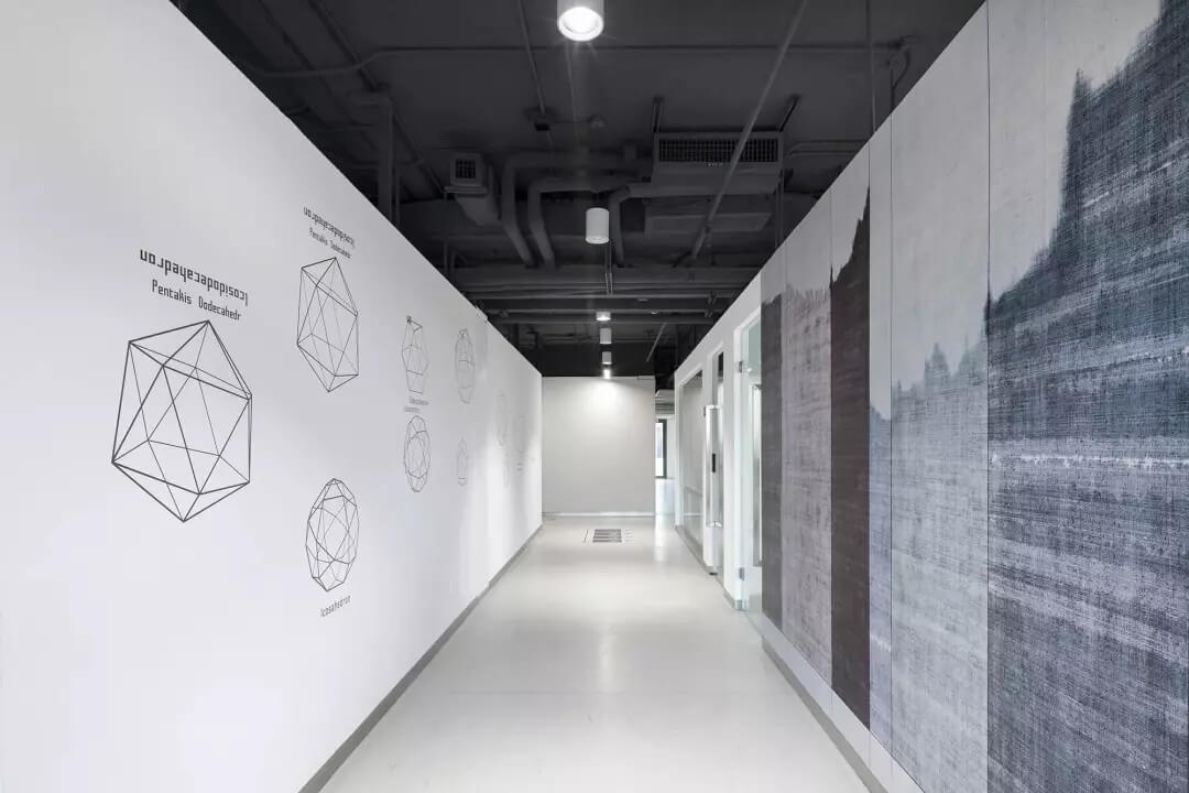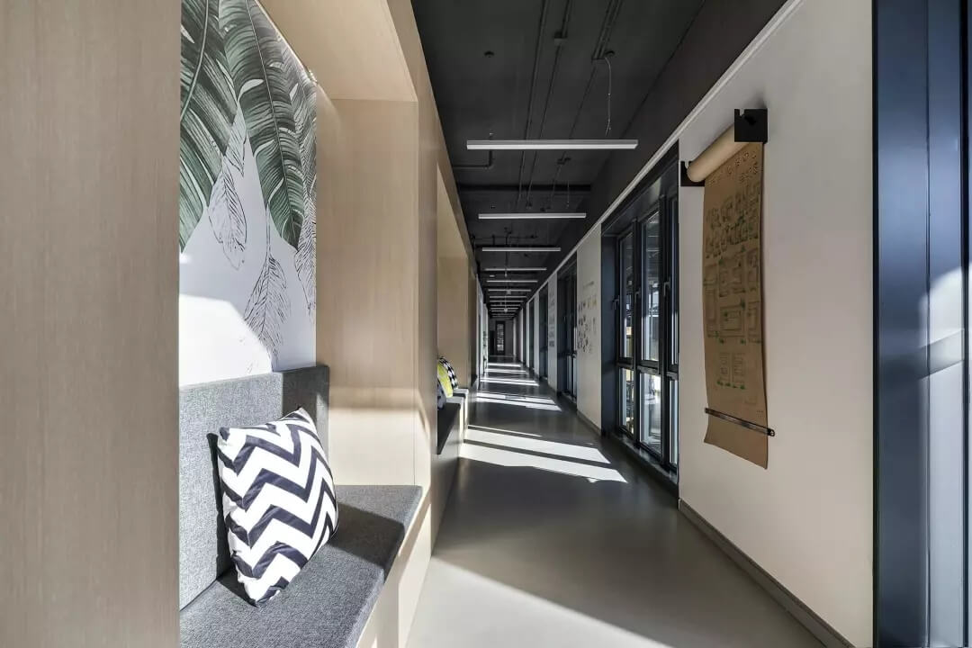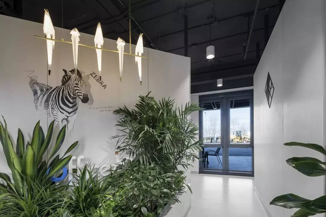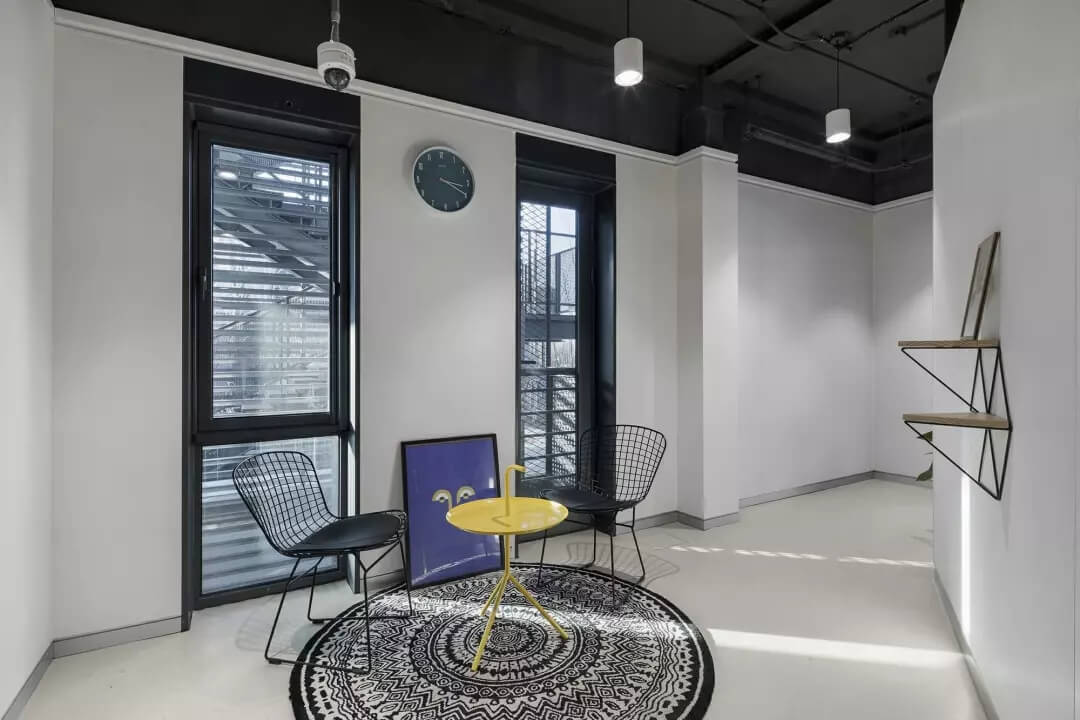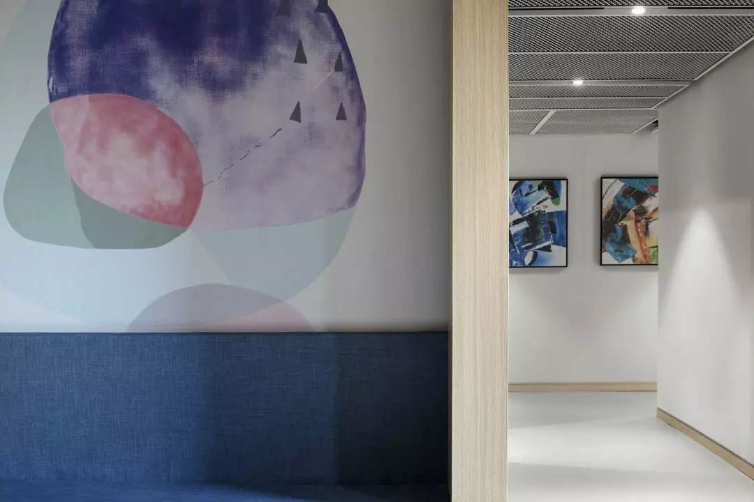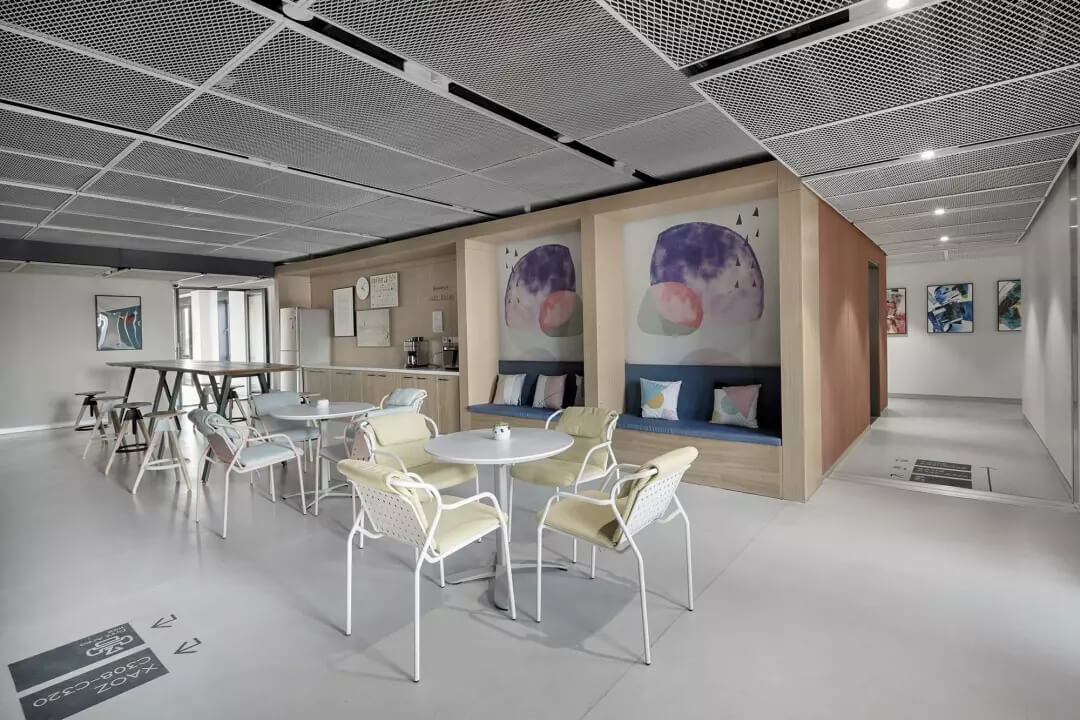 至于盒子以外的空間,我們想凝聚更多的人文藝術氣息,選擇較多地去鋪陳展示各種抽象的藝術線條和畫作,同時為了不失去生活氣息,各個角落選擇顏色比較跳躍的家居什物,讓它作為一個流動的戶外廣場,讓人可以自在穿行其中,偶爾停駐觀察,經得住人聲鼎沸的喧擾,亦能提供心靈靜憩的安寧。在這里,大家認真辦公、生活、盡情交流、分享,它就是一個安放綠意,有極高包容度的公共空間。