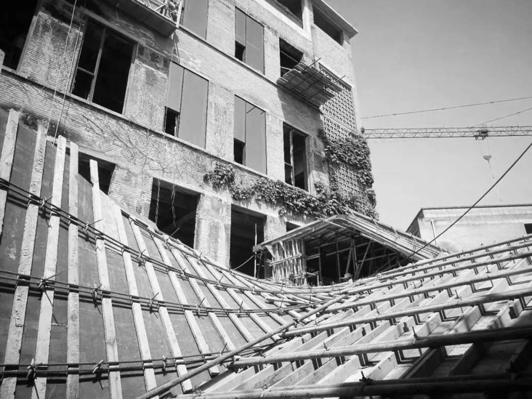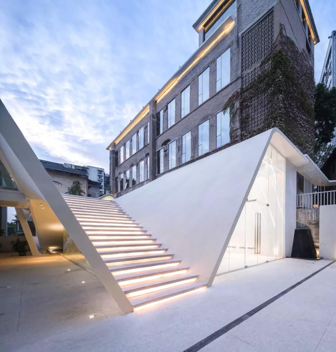 新娘嫁衣舞動的裙擺是美妙的經(jīng)典場景;如果我們把老樓喻成是待嫁的新娘,尋常設(shè)計的任務(wù)是為之設(shè)計一件合宜的嫁衣,輕盈而柔軟地連接起兩幢老建筑,也使得老舊廠房空間呈現(xiàn)出全新的面貌。