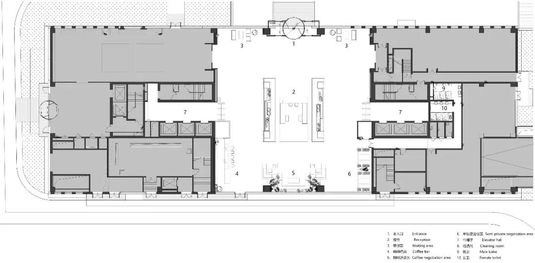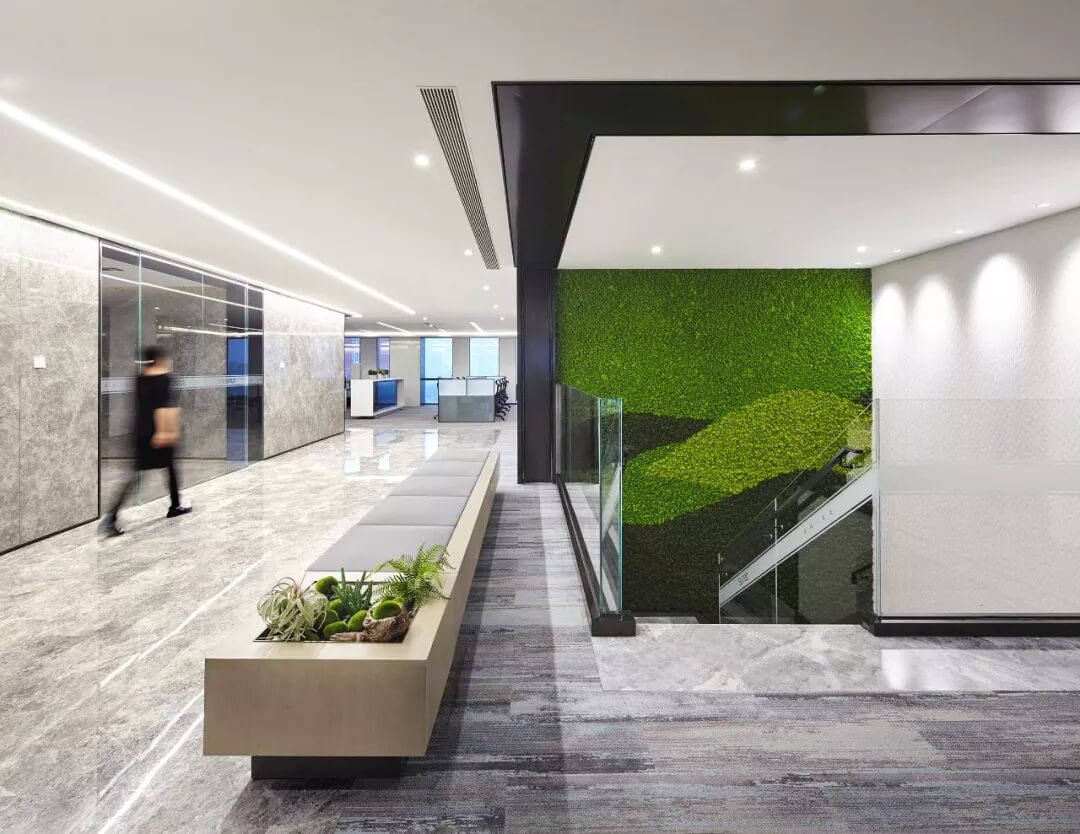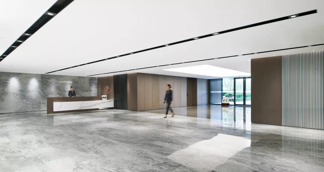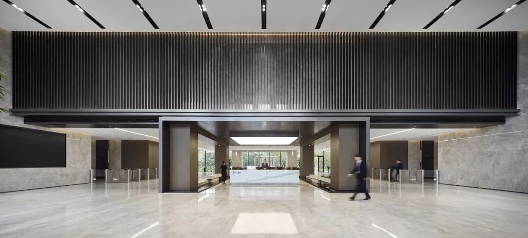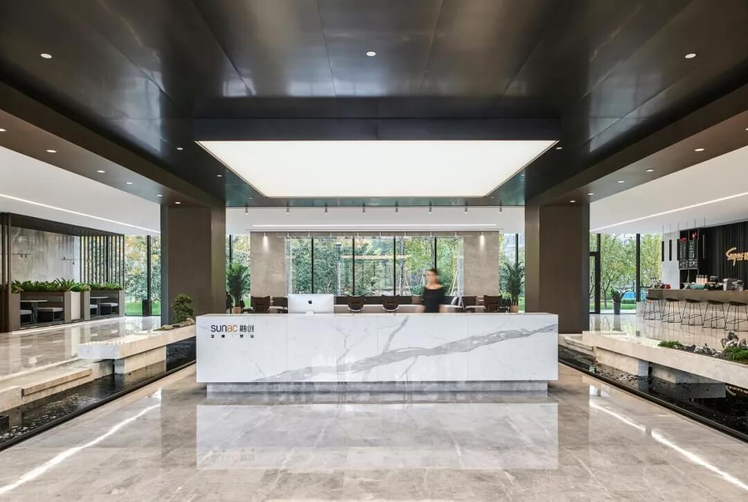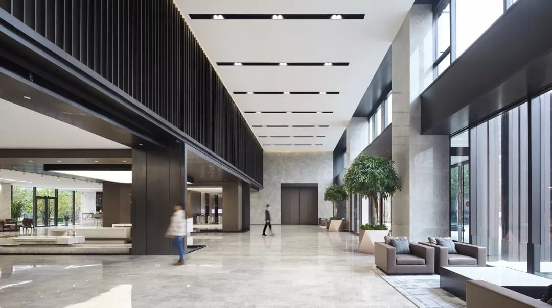 大堂是開放,通透,自然的園林式空間,自成一片天地。踏入大堂即可看到前廳接待島,方形四面通透的造型,嚴(yán)謹(jǐn)不失靈活,結(jié)合流動(dòng)水景和盆景,營(yíng)造了生態(tài)的,四季怡情的綠色辦公。電梯廳出入口在接待島兩側(cè),實(shí)現(xiàn)快速集散,避免上下班高峰期等候擁堵。咖啡等候區(qū)玻璃窗形成框景,把室外花園內(nèi)的四季變幻,自然元素都納入到室內(nèi)來(lái),形成情景共融。