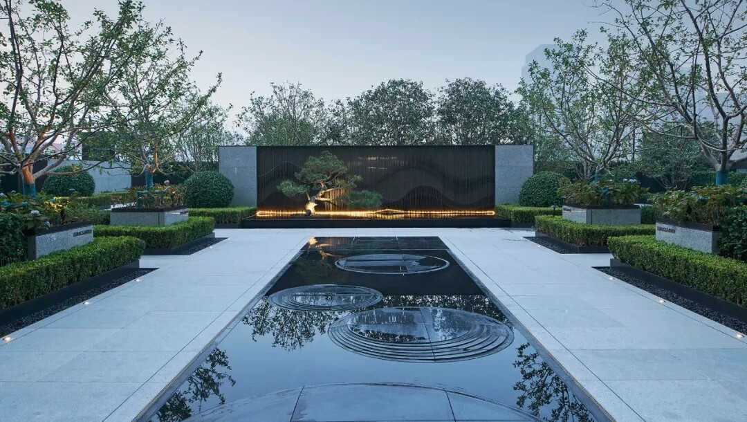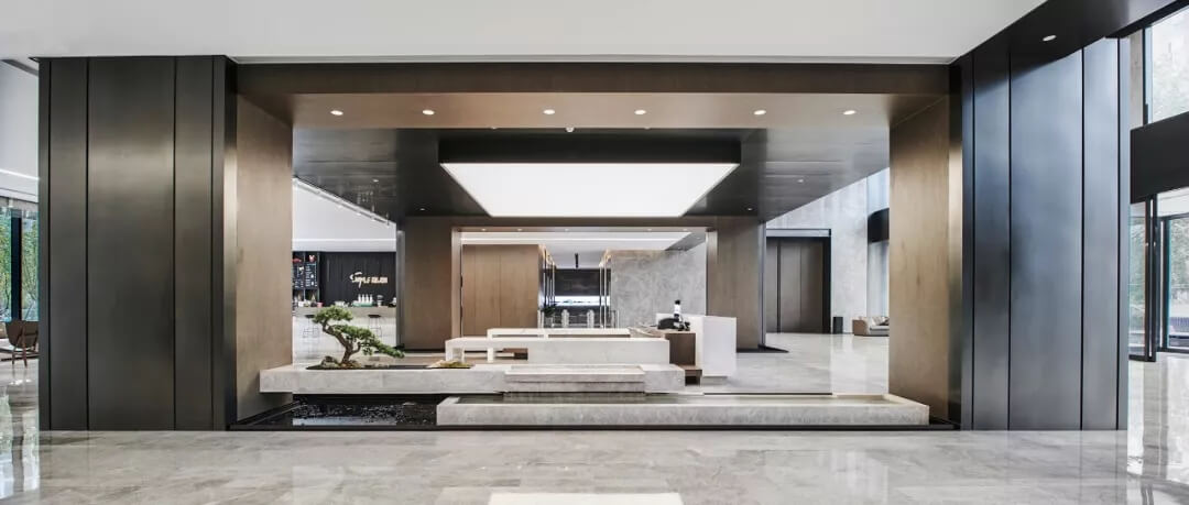 設(shè)計(jì)師通過(guò)空間布局,材料選用等營(yíng)造出大堂沉靜務(wù)實(shí)、理性的空間氛圍,咖啡,水聲,盆景,窗外的花園,以及往來(lái)的員工,客戶和行人賦予這里靈魂和氣息,使整個(gè)大堂充滿各種可能性。