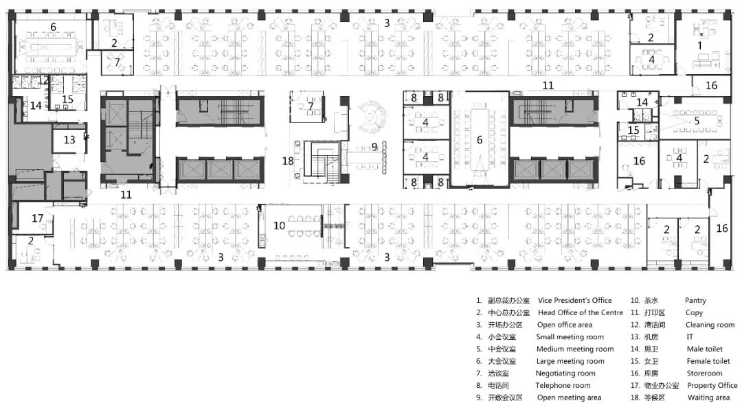 在空間規(guī)劃和功能布局上,兩側(cè)光線條件良好的區(qū)域設(shè)置開敞辦公區(qū);核心筒區(qū)增設(shè)存儲(chǔ)空間、電話間,洽談空間,會(huì)議室,滿足各種洽談會(huì)議需求;電梯集散口設(shè)置樓梯吹拔等候區(qū)、茶水區(qū)、景觀小品等開放共享和展示空間;采光較弱的中間區(qū)域,插入玻璃盒子做會(huì)議室。整個(gè)平面布局,在原建筑條件基礎(chǔ)上,融合融創(chuàng)需求,級(jí)級(jí)遞進(jìn),相互銜接。