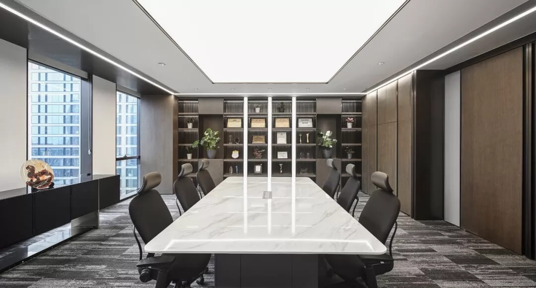 設(shè)計(jì)師綜合融創(chuàng)的不同會(huì)議使用訴求以及原建筑結(jié)構(gòu),在空間布局上,打造核心筒混合會(huì)議帶,不同大小、不同形式的會(huì)議空間嵌套在每層開放辦公區(qū)的不同位置,滿足多元化會(huì)議需求;卡座,開敞洽談區(qū),休閑洽談區(qū)滿足互動(dòng)交流,頭腦風(fēng)暴式會(huì)議需求。多層次多功能的交流會(huì)議由智能系統(tǒng)高效管理,體現(xiàn)融創(chuàng)開放、包容的企業(yè)文化。
