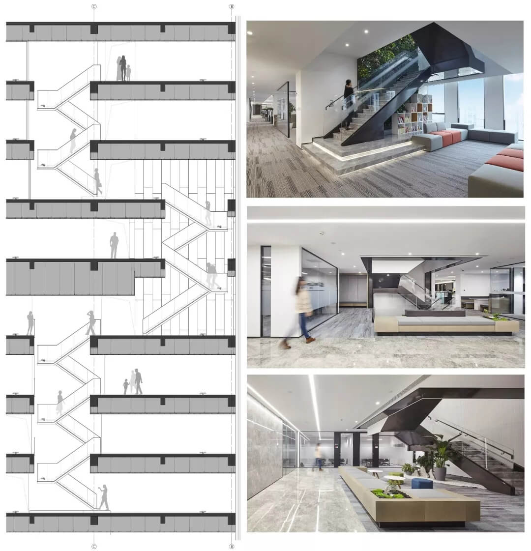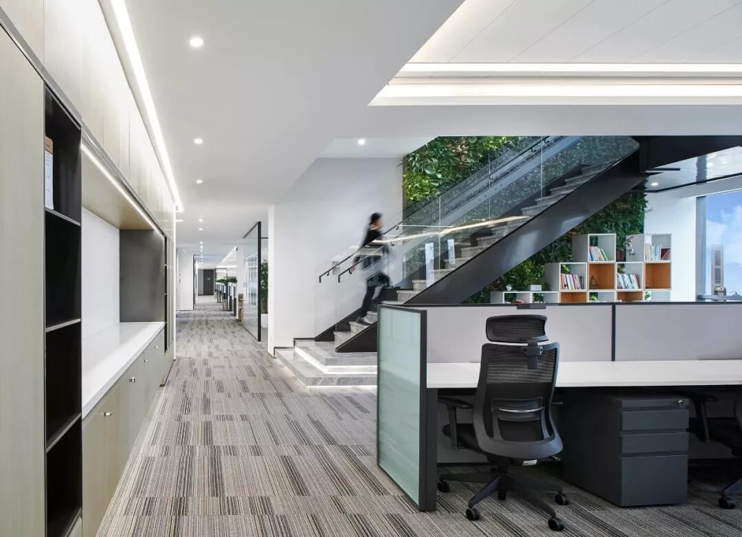 步梯采用極簡(jiǎn)折轉(zhuǎn)的造型和玻璃材質(zhì),每層的樓梯區(qū)結(jié)合景觀設(shè)計(jì),聯(lián)通電梯入口,茶水間,設(shè)置景觀小品,圖書閱讀空間,洽談卡座,等候區(qū)等,形成辦公空間的共享交流區(qū)和創(chuàng)意生活區(qū),打造有活力,展示性強(qiáng)的員工休閑活動(dòng)區(qū)。