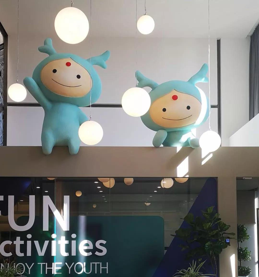 此區(qū)域另外的一個亮點是在會議室頂端利用空間設(shè)置了“龍小湖”巨型卡通造型,同此空間的人招手互動,為空間帶來了一種親和的童趣。也是傳達龍湖企業(yè)形象的一處絕佳空間。