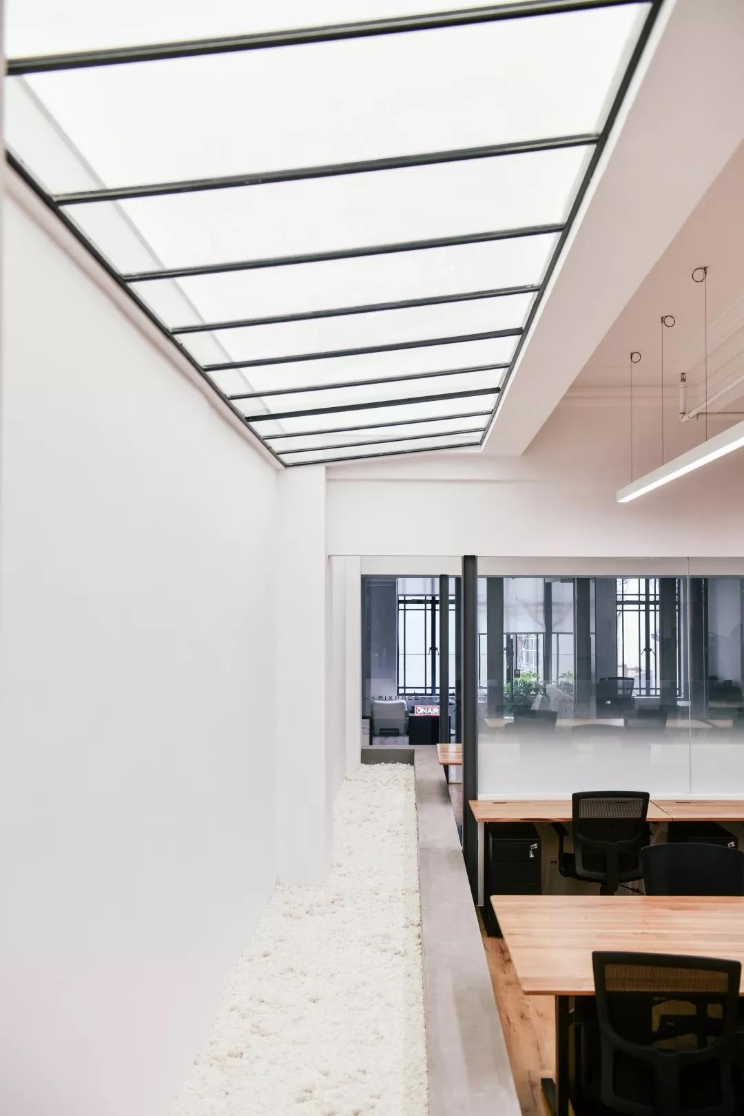 總共三層的空間由于老建筑既有格局的影響,采光較差,我們在有限的面積中挖出一個中庭,同時利用原有的破損樓板創(chuàng)造了若干“天窗”,巧妙地使用照明來創(chuàng)造光亮,消解歷史建筑本身的體量和沉重感。因此,從略顯晦暗、滄桑的歷史建筑走進辦公空間是一種如釋重負(fù)的輕快和光明。