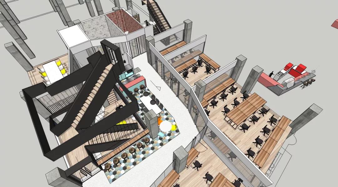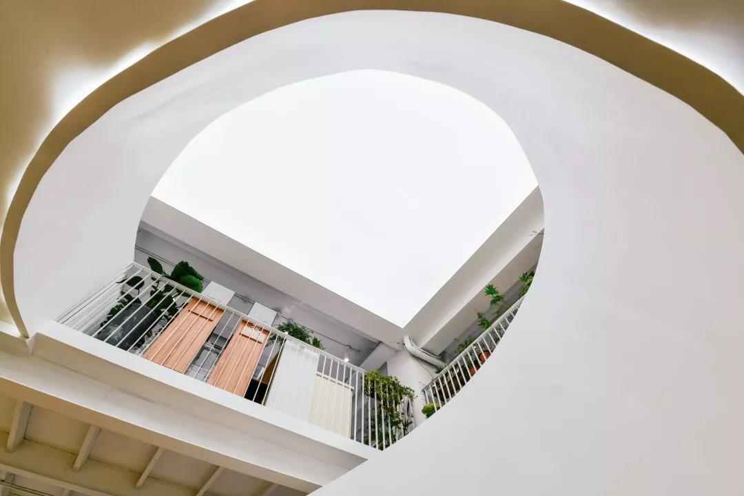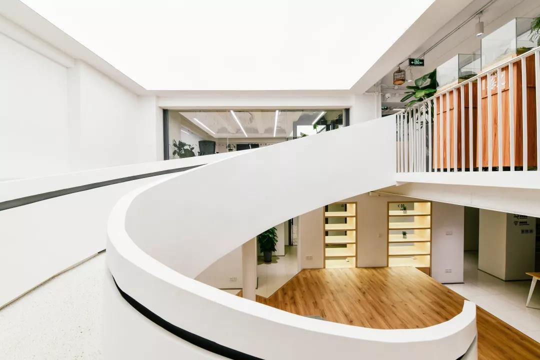 整個空間最大的視覺中心便是中庭里那個“刻意”彰顯存在感的樓梯,優(yōu)美的弧線激發(fā)并引導(dǎo)著大家探索上層空間的欲望。在最初的方案中,它其實并不是曲線,而是剛毅的直線,我們認(rèn)為直線的迷人在于它的簡單、坦誠,棱角分明且封閉的做法讓它如雕塑一般矗立。