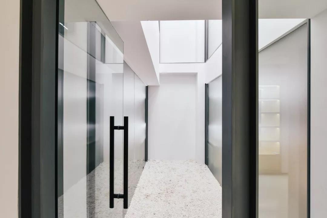 出于功能的需要,我們不得不在空間中加入隔墻,但為了讓老房子的肌理更加清晰,隔墻在與天花線腳的交界處切割為線腳的形狀,令原有天花線腳在視覺上保持連續(xù)。新置入的墻也一再被簡化,只有片段的玻璃、白墻、鋼柱直接裝在舊有構(gòu)筑上。同時,為了盡可能減少干擾視覺的繁瑣因素,我們對細(xì)節(jié)反復(fù)推敲,讓每一處純粹到極致。
