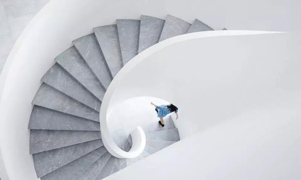 從中庭的自然光到室內(nèi)的人工光,大廈的光影在豁然開(kāi)朗和細(xì)致入微之中不斷變換。中庭必須和天空有所交流,尤其是霧霾肆虐的今天,藍(lán)天顯得特別稀有,在中庭上方加蓋玻璃幕墻為上策。流空素影正翩翻,使得存在于強(qiáng)烈靜態(tài)空間體驗(yàn)中的人又能同時(shí)感受到光影與云卷云舒的動(dòng)態(tài)變化。在典型的辦公樓層,小型私人會(huì)議室從中庭立面懸挑而出,并錯(cuò)落有致,打破了中庭的單調(diào),并增加了最小辦公空間的面積。一側(cè)的螺旋樓梯飄逸靈動(dòng),用混凝土演繹出的獨(dú)特輕薄感如風(fēng)裳皎立,引辦公的人們靈感興發(fā)。
