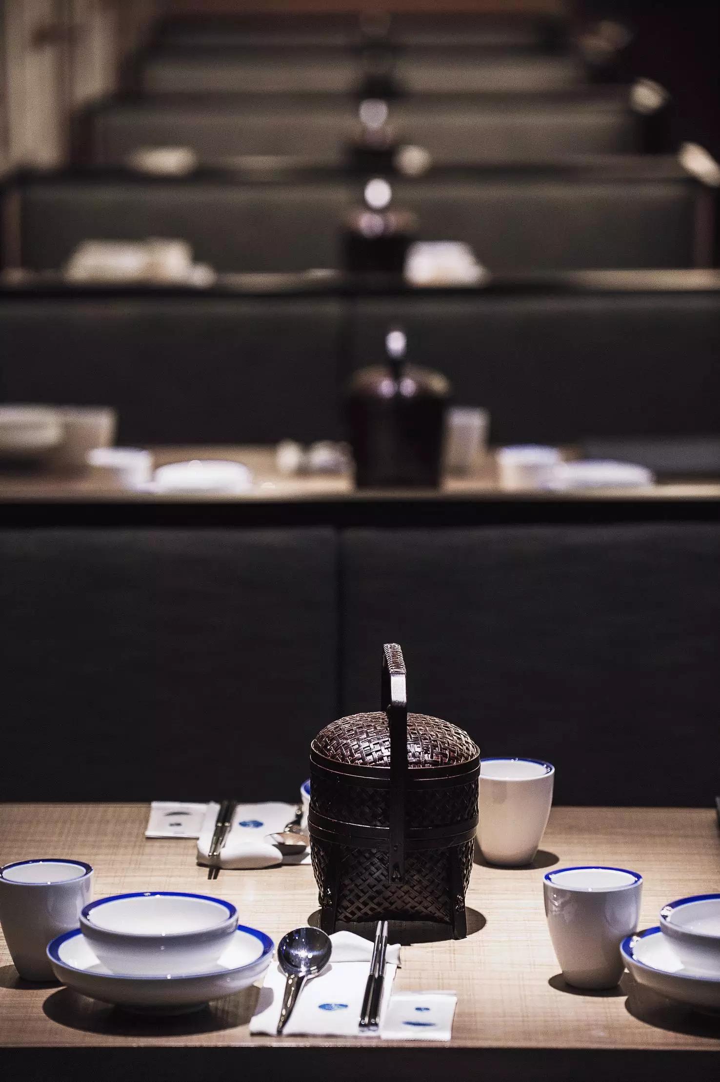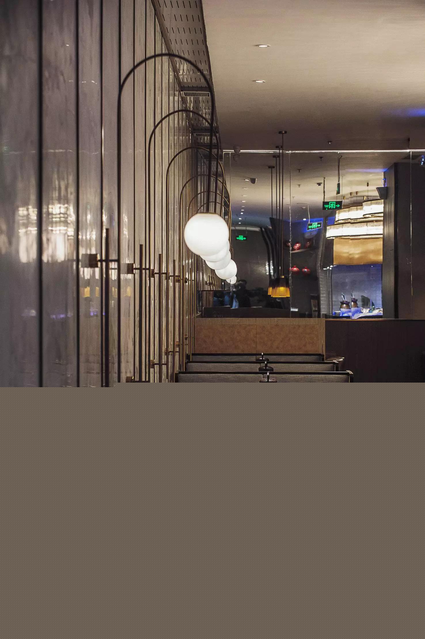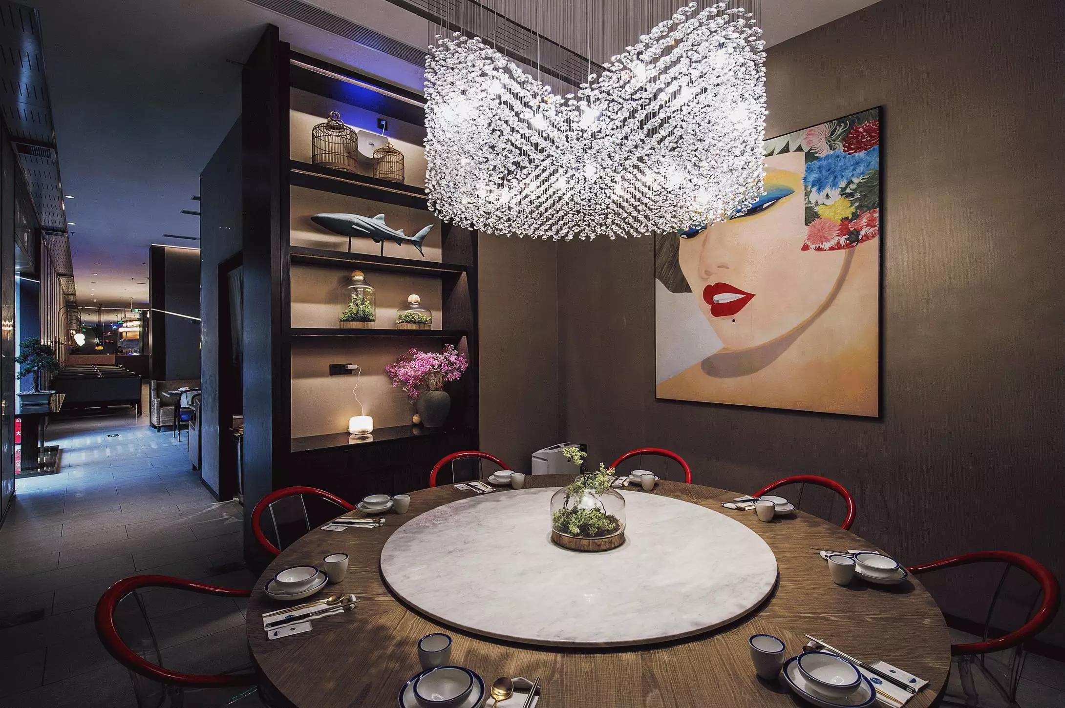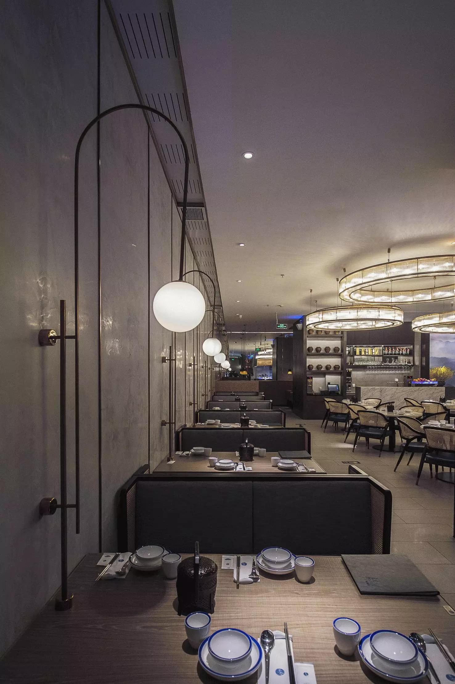 用餐區(qū)完全是一個開放的空間,沒有很多的隔斷,圓桌和方桌有序排布,既充分利用了空間又避免了單調(diào),結(jié)合燈具的設(shè)計(jì),就像在老家庭院里的大家庭聚餐——夜晚,歸來的親人們,在清涼的月色中,你來我往,和和樂樂,傳遞此間。