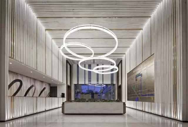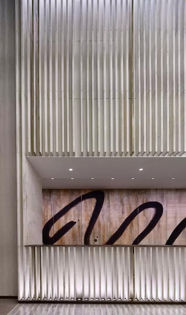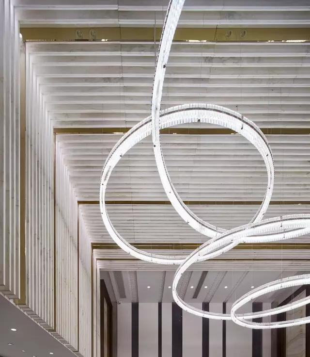 天花和墻體以犀牛白大理石片狀方式陣列,石材與石材之間加入香檳色鏡面不銹鋼做為分隔,巧妙地渲染了空間的尊貴價值感,也很好地提升了視覺的立體感。