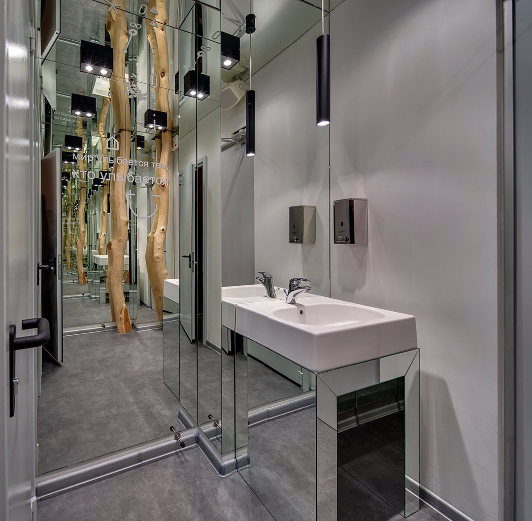整個(gè)空間共有三層。一層空間將有照明的大型金屬logo面板緊貼玻璃樓梯圍欄設(shè)置,歡迎客人的到來(lái),并通過(guò)動(dòng)態(tài)照明來(lái)強(qiáng)調(diào)出長(zhǎng)接待臺(tái)。